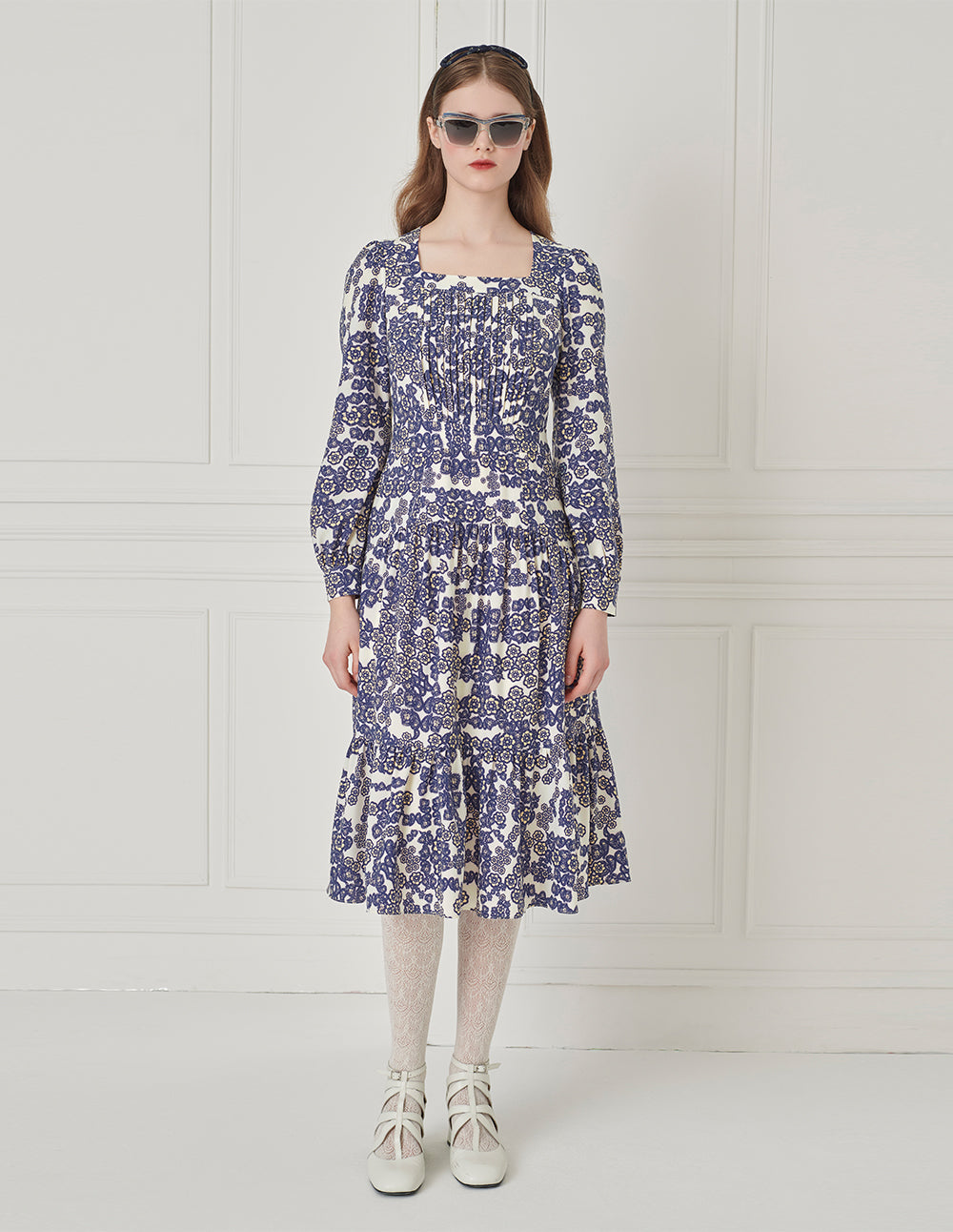 This dress features a romantically arranged print with an elegant classical charm. The retro square neckline highlights refinement, while a full pleated skirt adds softness and graceful movement. As part of the autumn-winter retro romantic style, this dress remains a cherished choice.