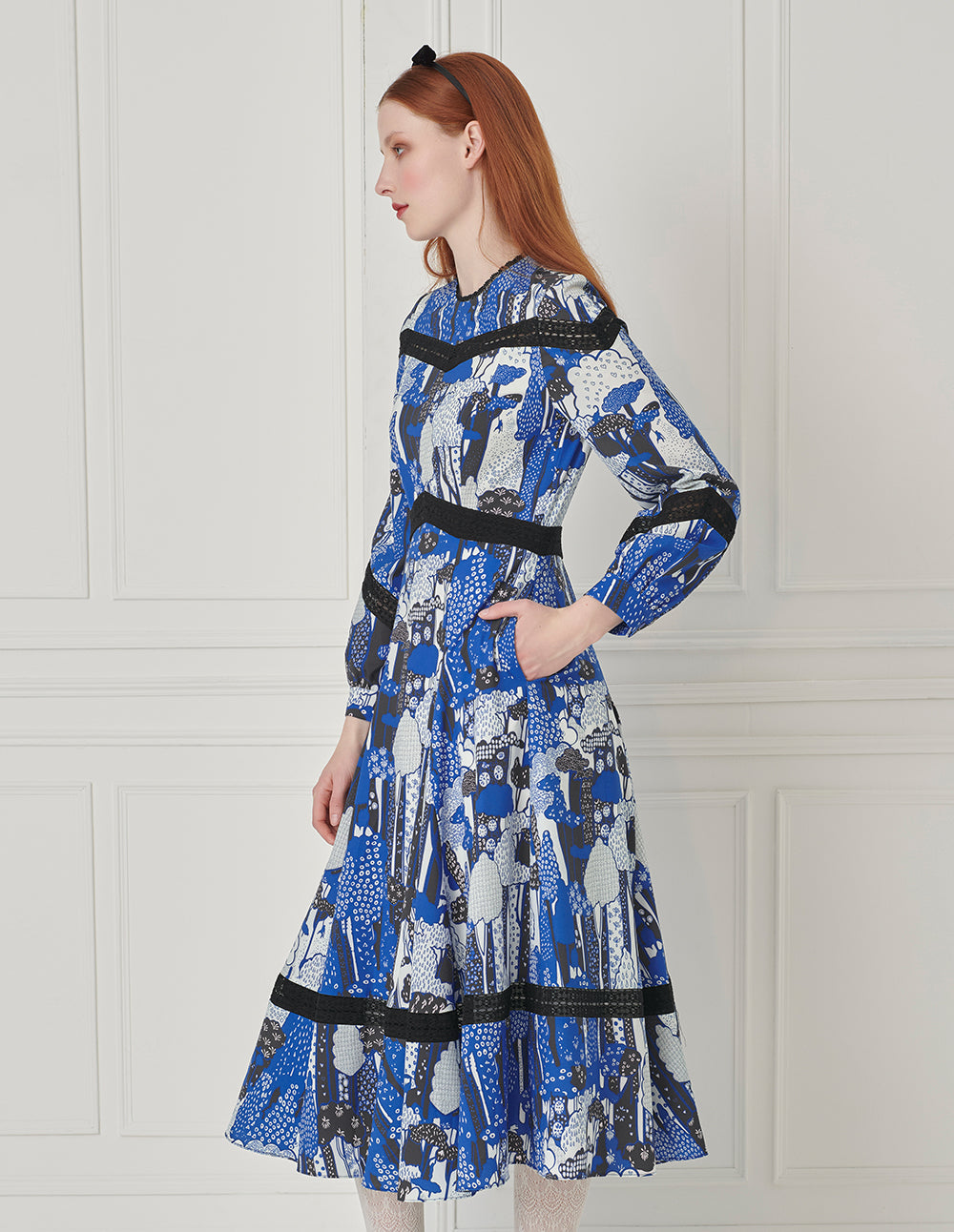 This printed dress is elevated with delicate color-block lace, while a round neck lace trim adds a touch of retro sophistication. The tiered ruffle and pleat design along the skirt creates a richly layered, feminine look—effortlessly shaping a graceful and charming lady-like style.