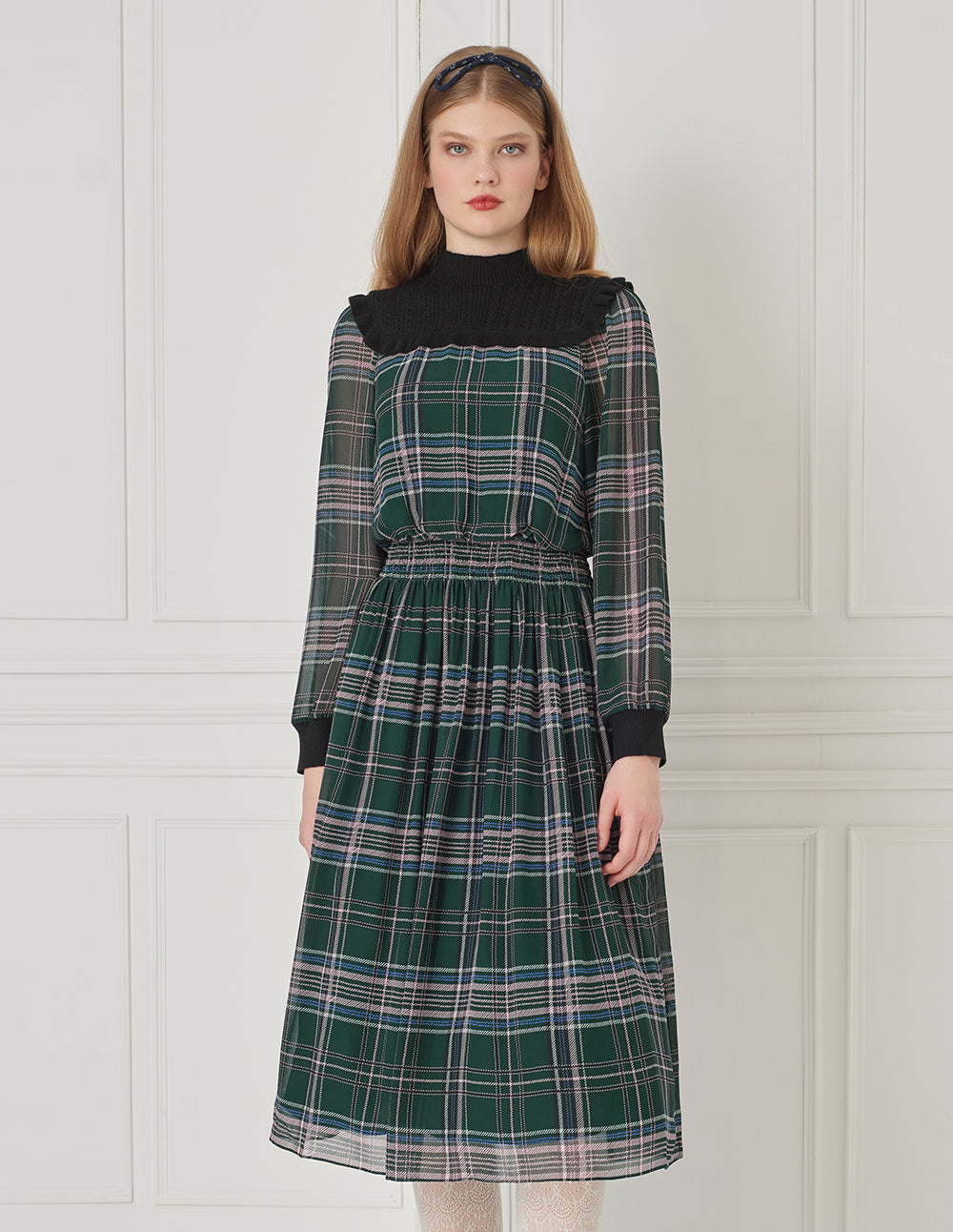 This printed dress is constructed with wool knit panels for a hybrid texture. The elegant high collar adds a refined, graceful look while providing warmth. Clean seaming offers structure and sophistication. Set against a deep green base with soft pastel plaid patterns, the design channels a timeless British retro charm.