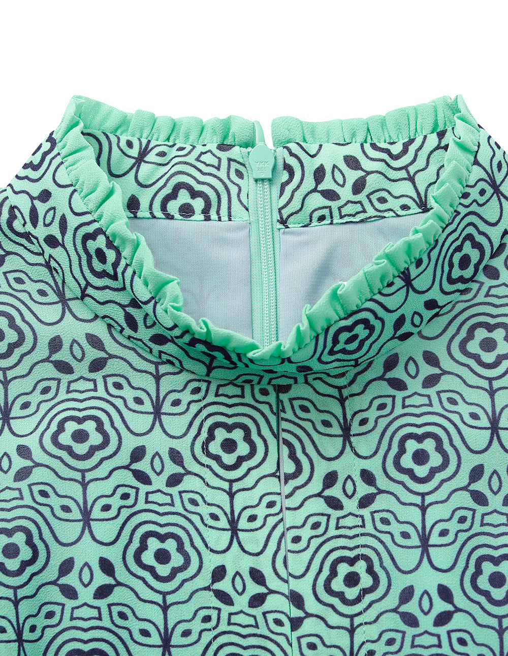 This printed dress features a lace-edged stand-up collar for a retro-inspired look. An elegant openwork design at the collar adds sophisticated charm, while abundant skirt pleats release a youthful, spirited energy.