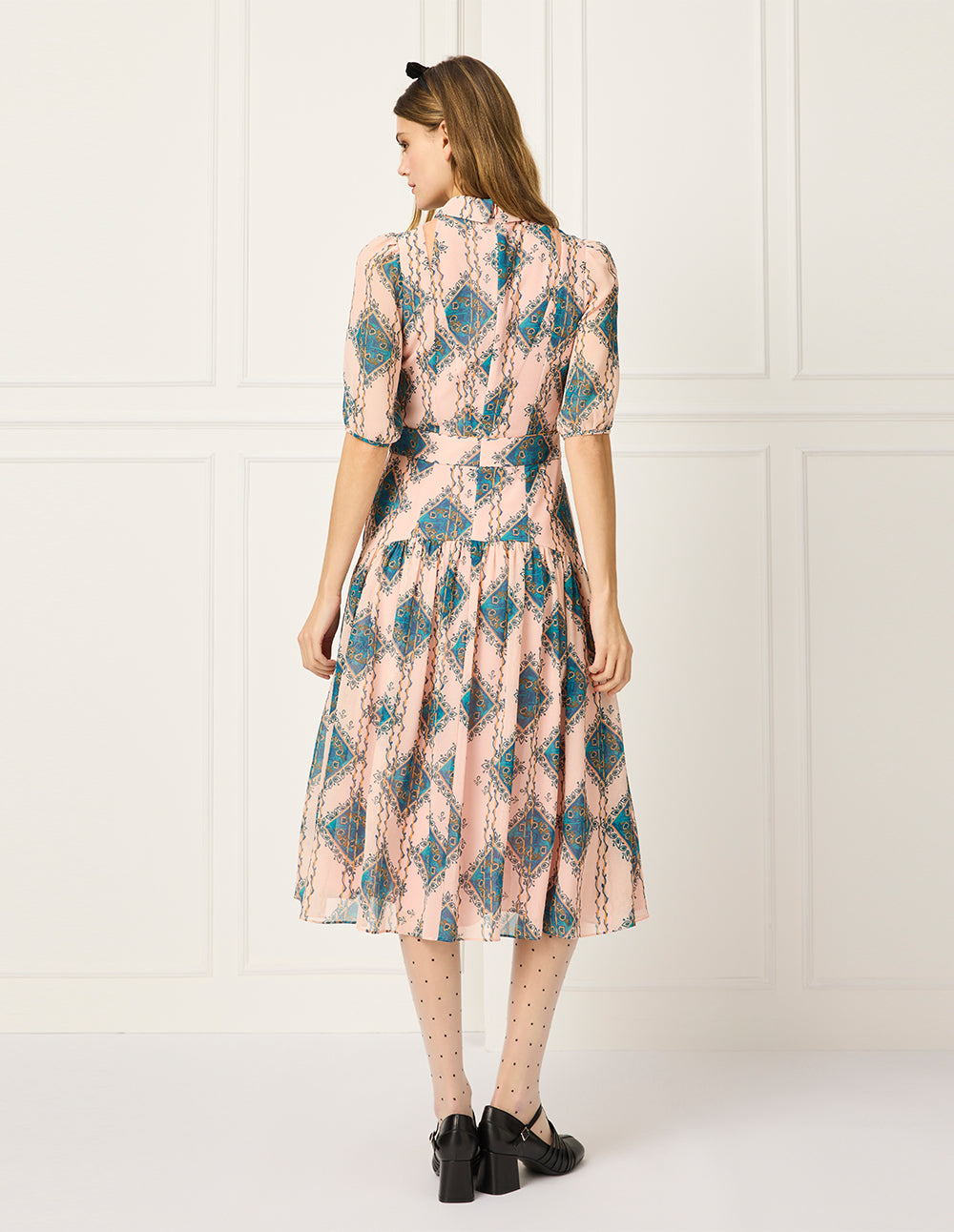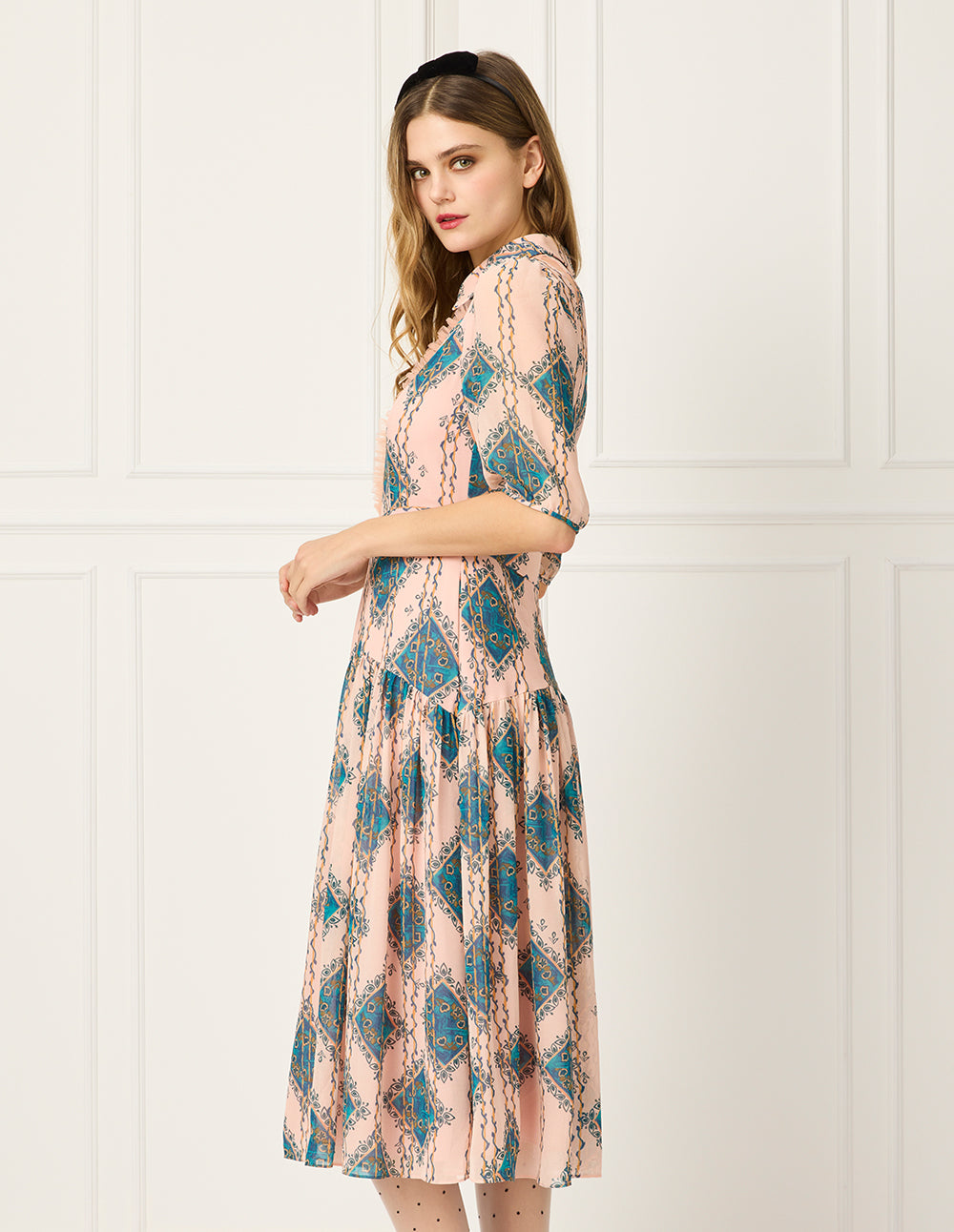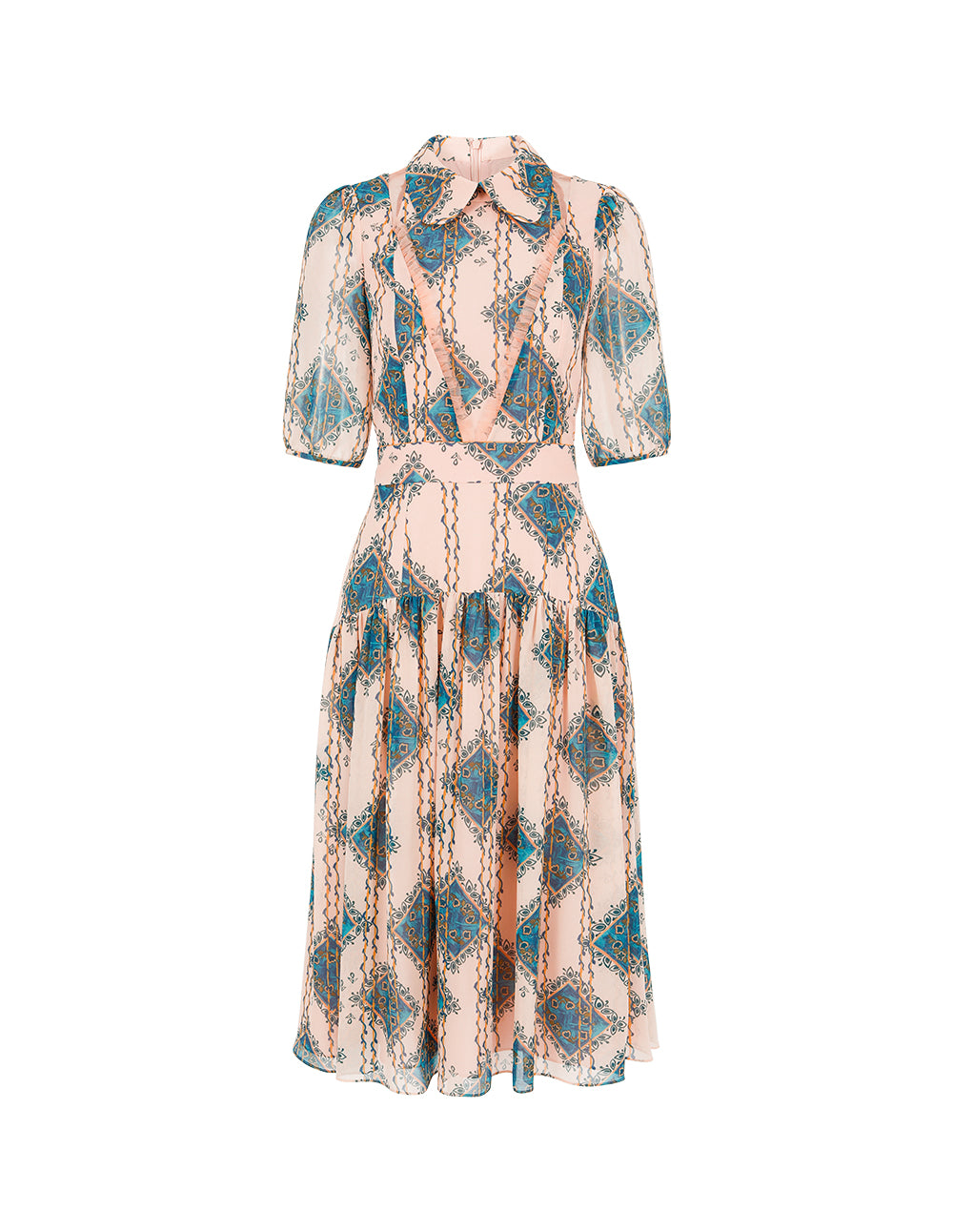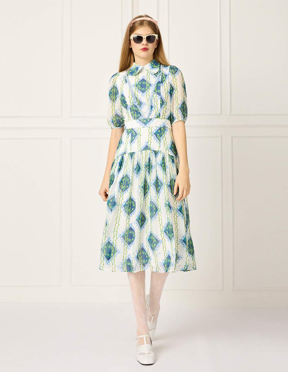 BORA AKSU Lapel Puff Short Sleeve Empire-Waist Geometric Print Pleated Midi Dress