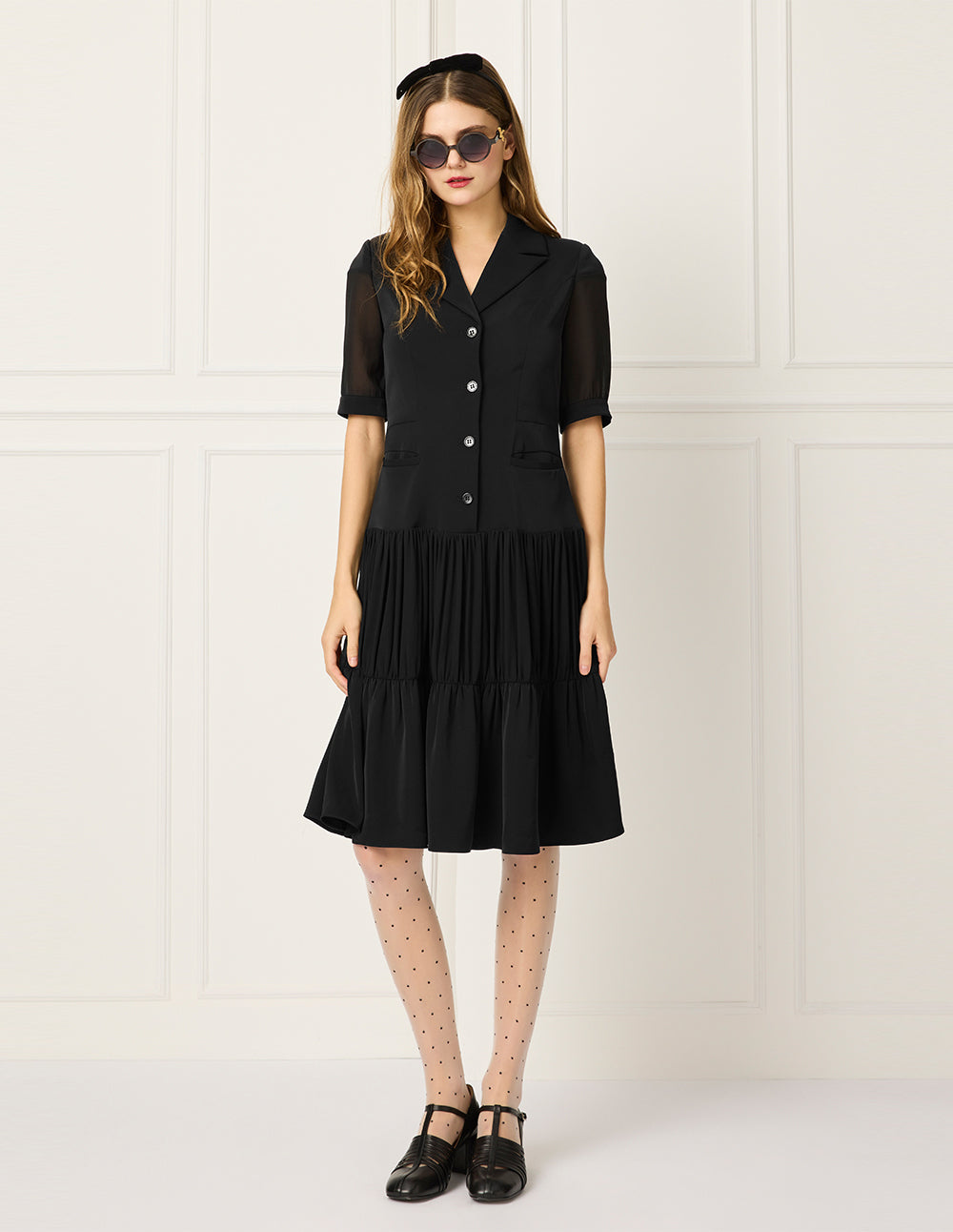 A crisp suit collar and structured shoulder line create an architectural silhouette, blending strength and softness to express the multifaceted appeal of the urban woman. Sheer bubble sleeves reveal skin with both romantic and tailored notes, while precisely spaced pleats at the hem form an elegant arc with every step.
