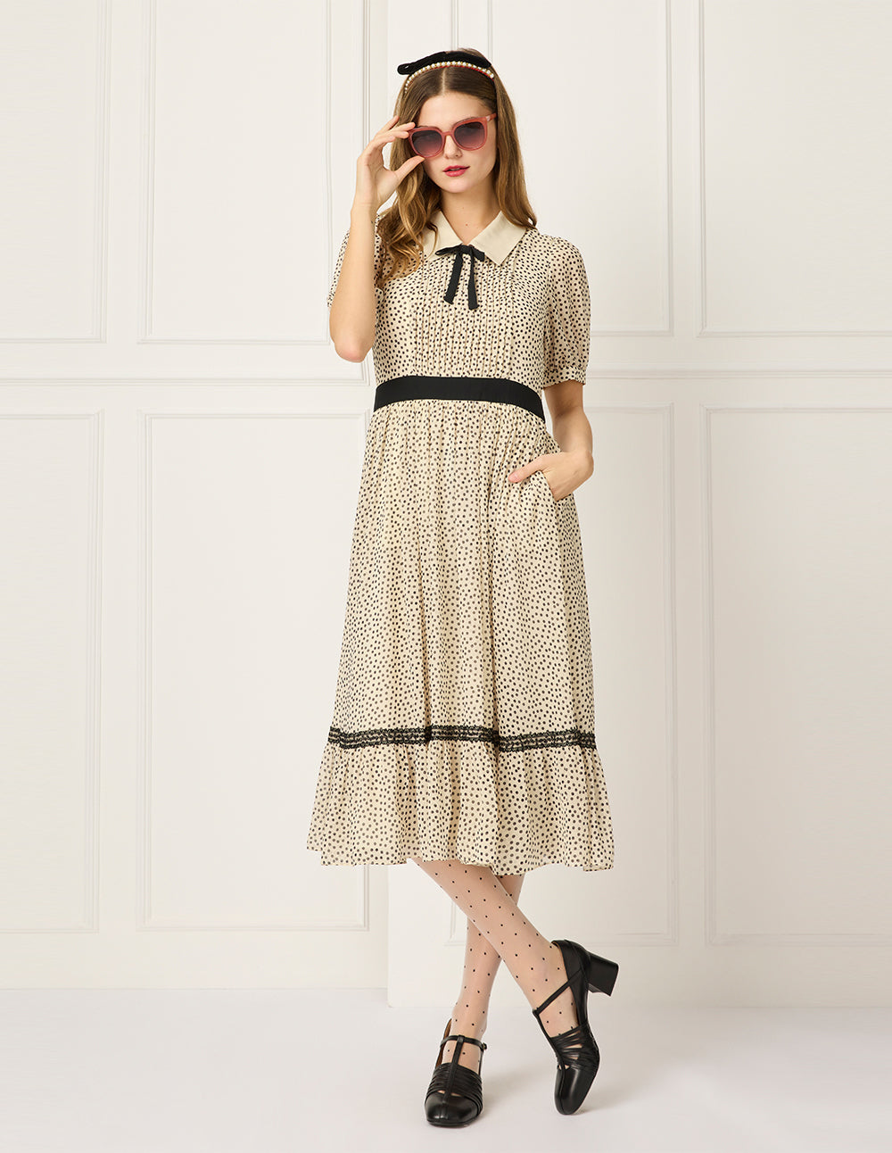 BORA AKSU Lapel Puff Short Sleeve Polka Dot Print Pleated Midi Dress