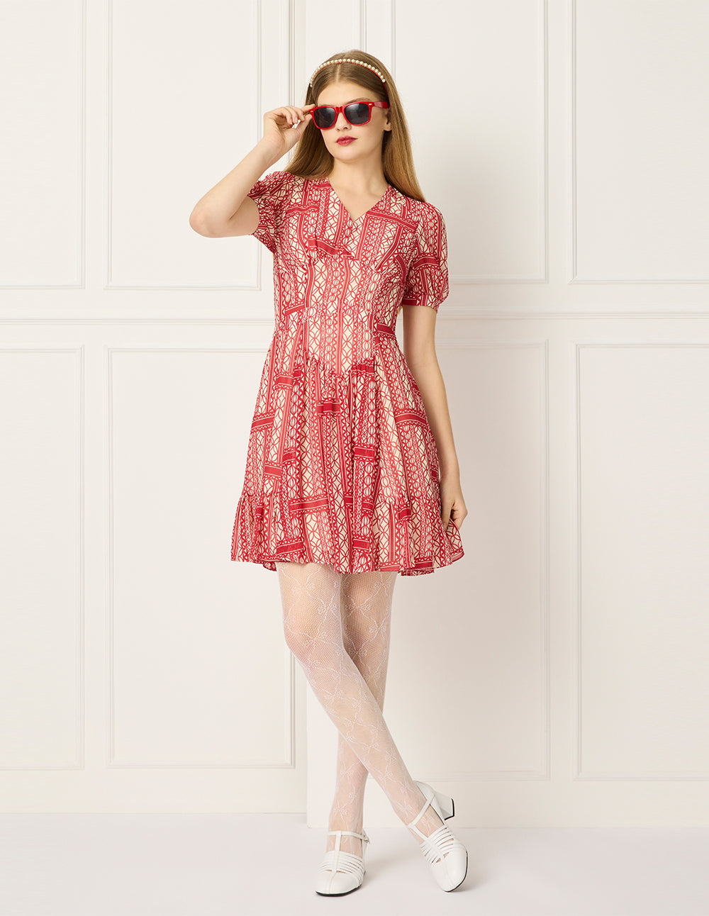 A vibrant red‑apricot hue recalls a Tuscan sunset—warm yet soft. Abstract geometric patterning follows the body’s golden‑ratio lines. The V‑neck elongates the neckline, while puffed sleeves gather at the cuff into a crisp, architectural arc. The A‑line skirt forms a perfect umbrella silhouette, turning each movement into a swirl of radiant color.
