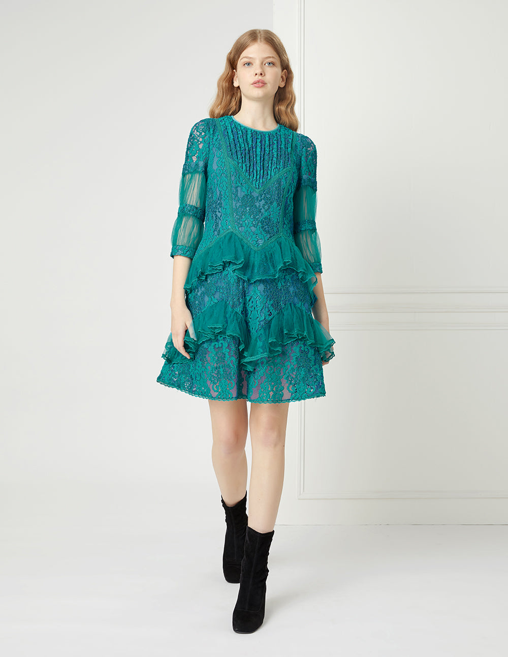 BORA AKSU Turquoise Blue Mesh Lace Ruffled Lace Mini Dress