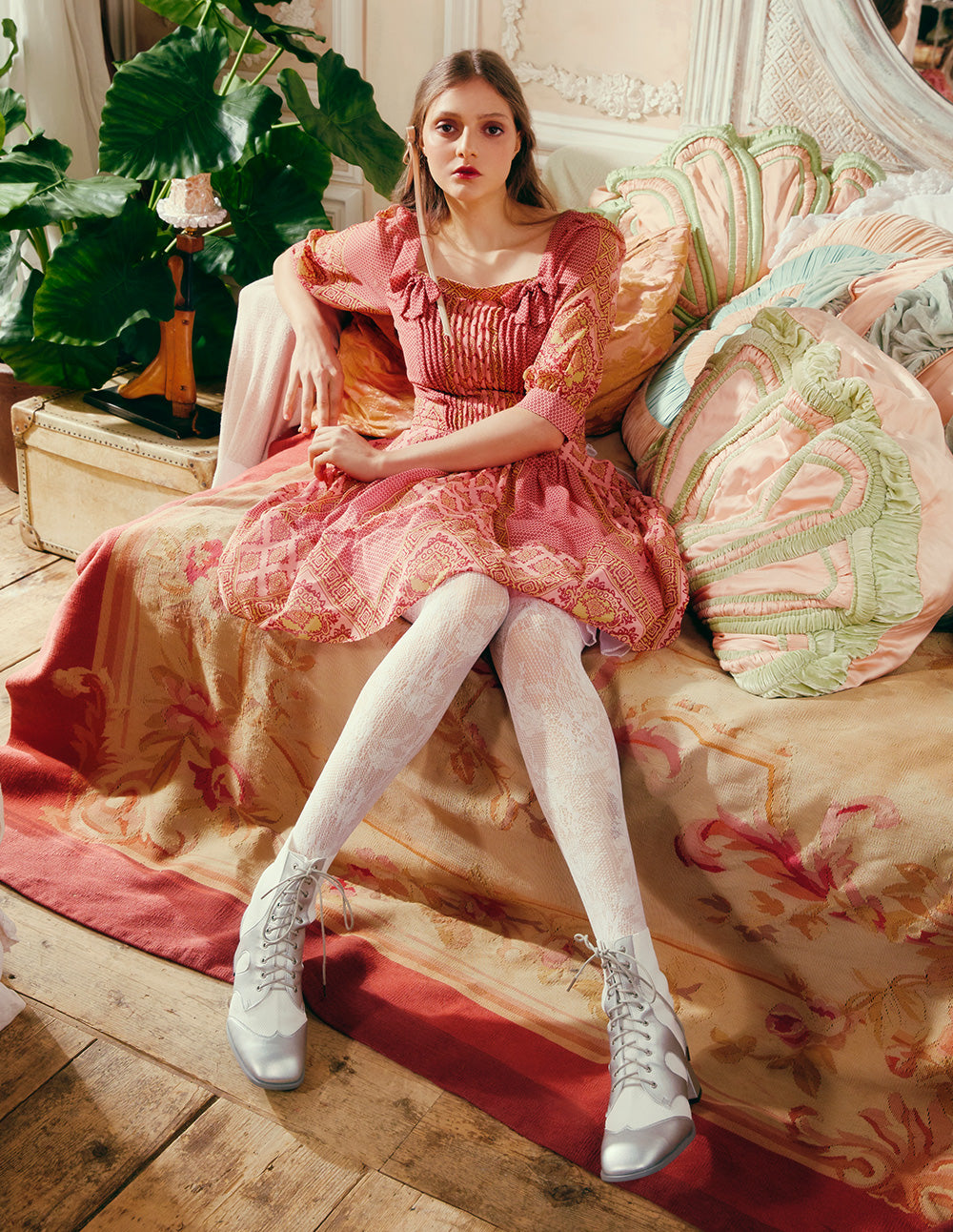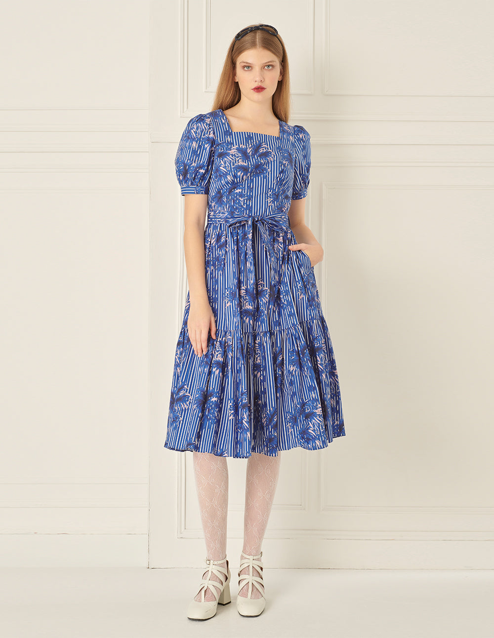 BORA AKSU Retro Square Neck Long Sleeve Pleated Printed Dress
