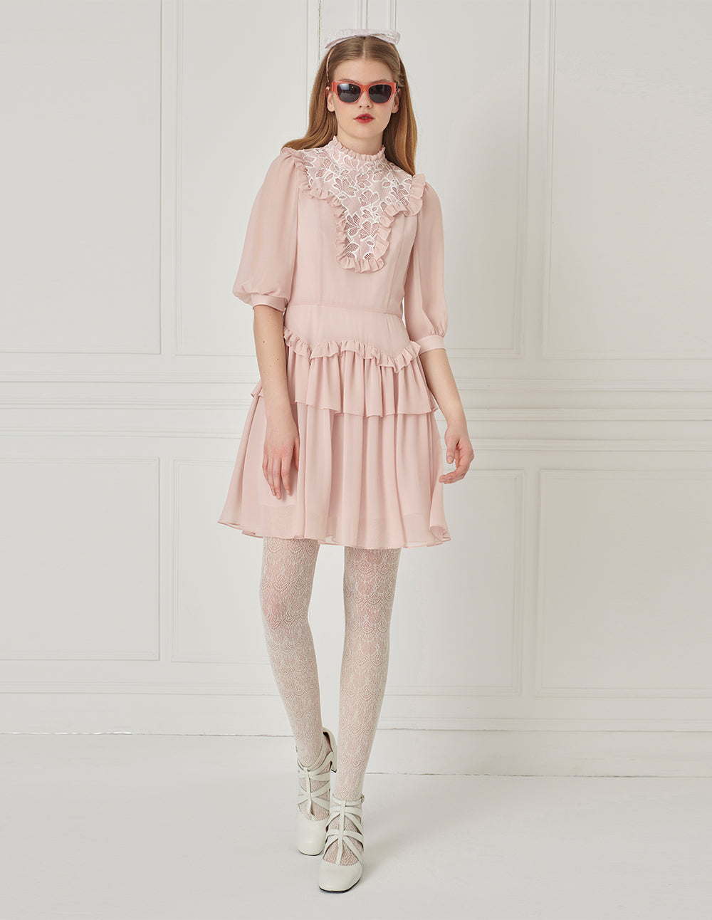 BORA AKSU Retro Puff Sleeve Lace Patchwork Ruffle Dress