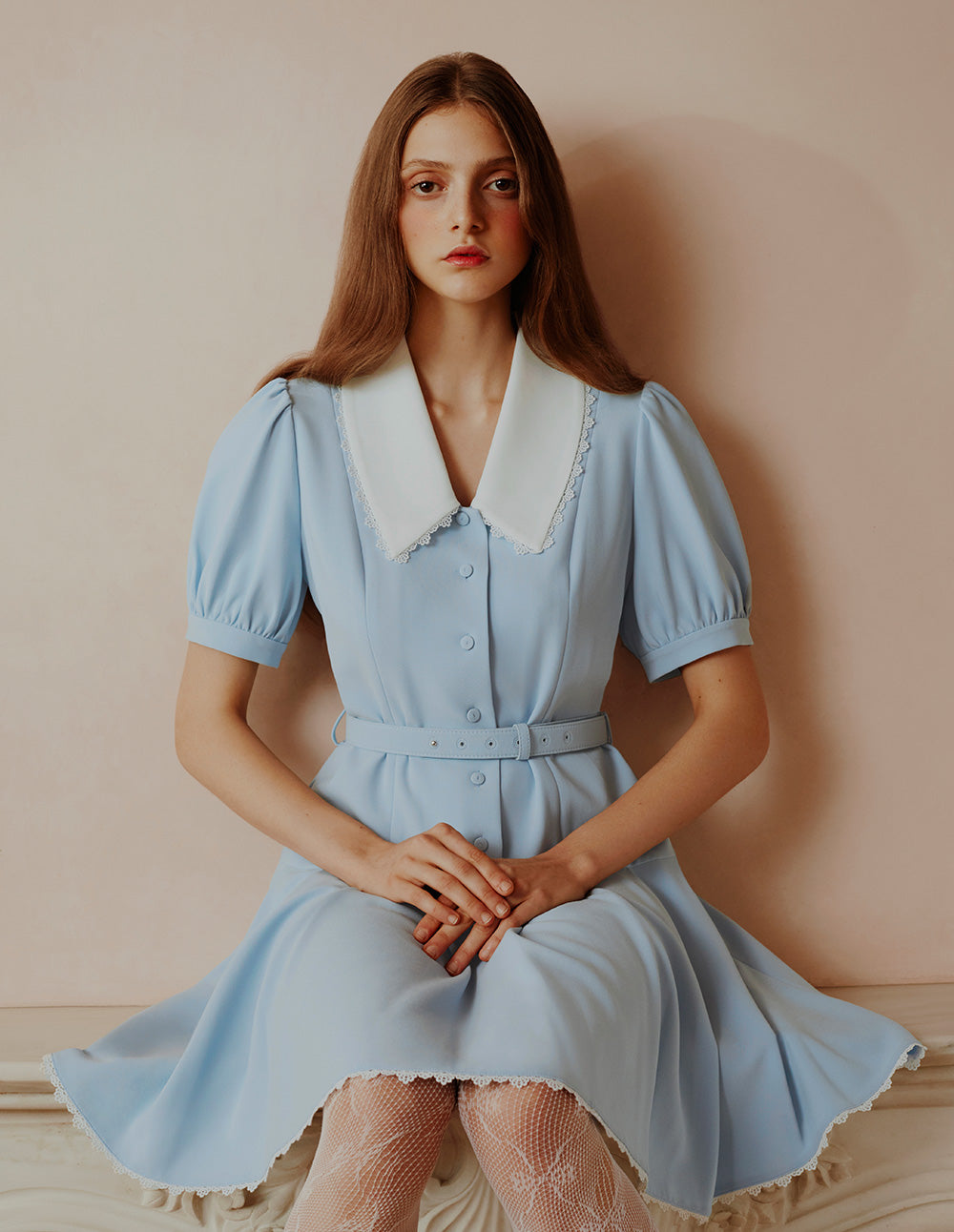 BORA AKSU Puff Sleeve Light Blue Slim Fit A-Line Dress