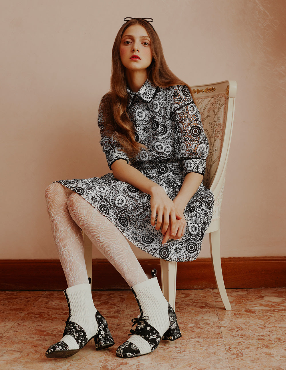 BORA AKSU Retro Puff Sleeve Diamond Collar Black And White Lace Dress