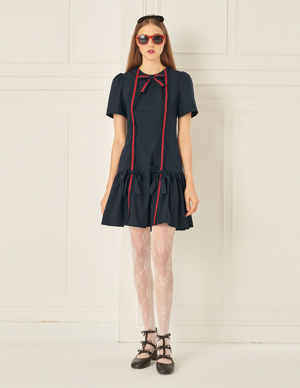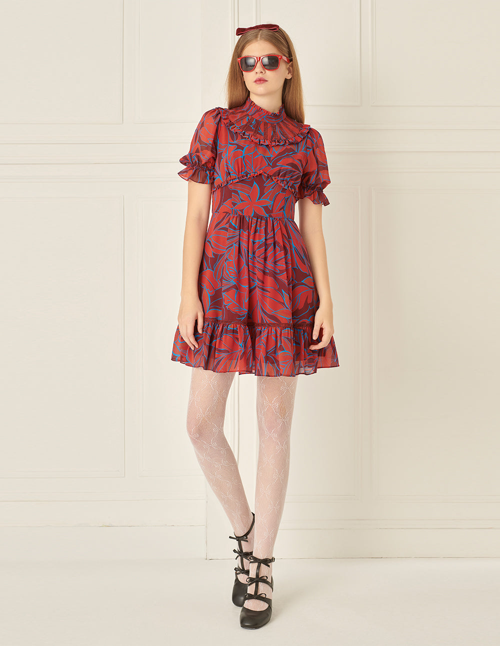 BORA AKSU French Stand Collar Puff Sleeve Bow Print Dress