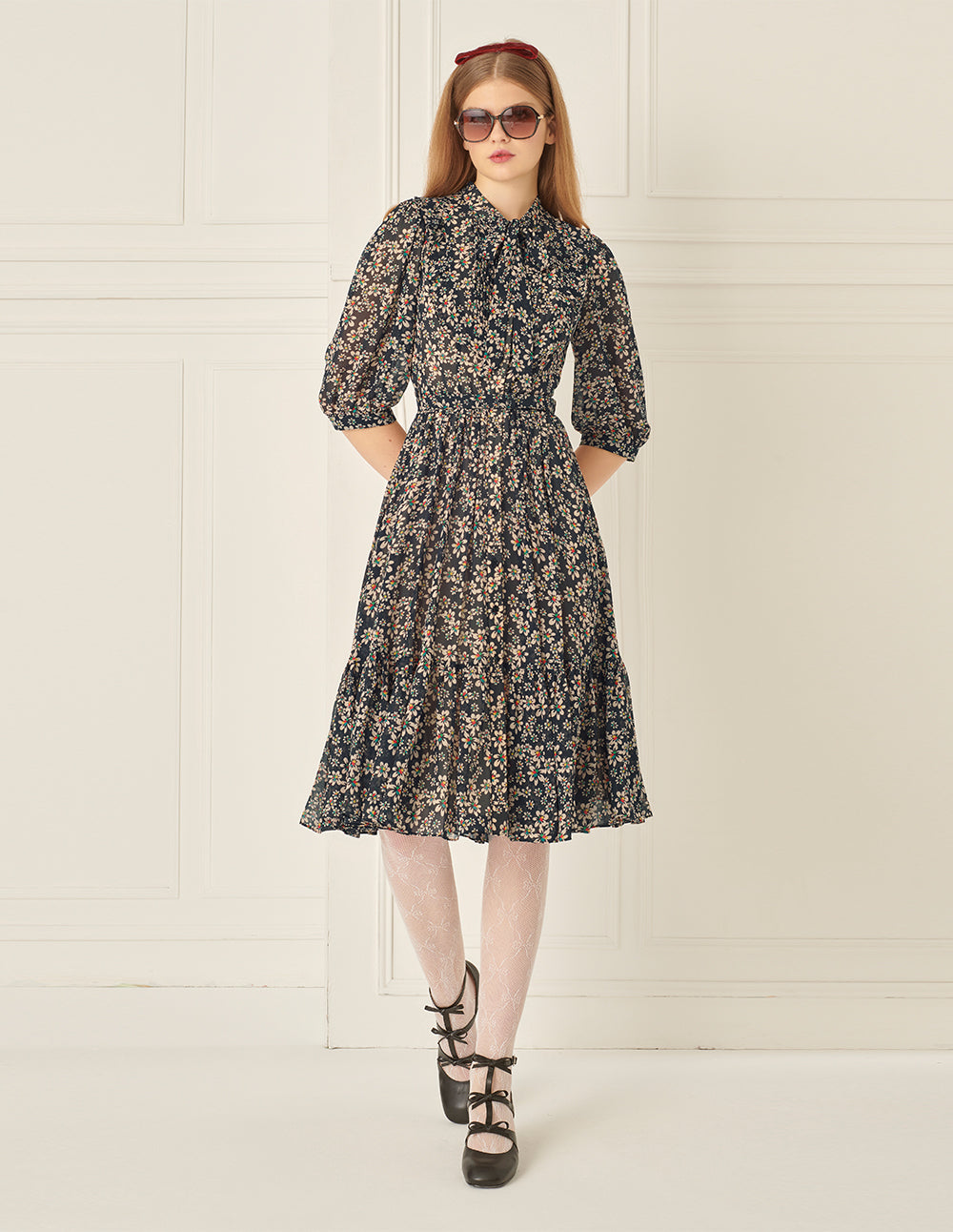 BORA AKSU Puff-Sleeved Bow-Neck Pleated Floral Dress