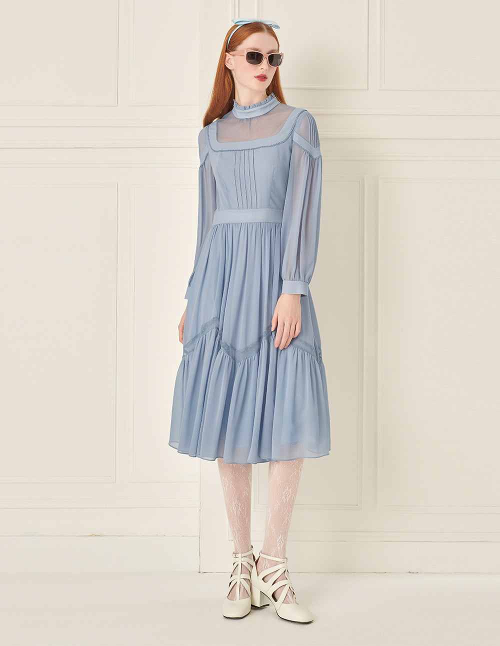 BORA AKSU Puff Sleeve Lapel Pure Cotton Mesh Patchwork Dress