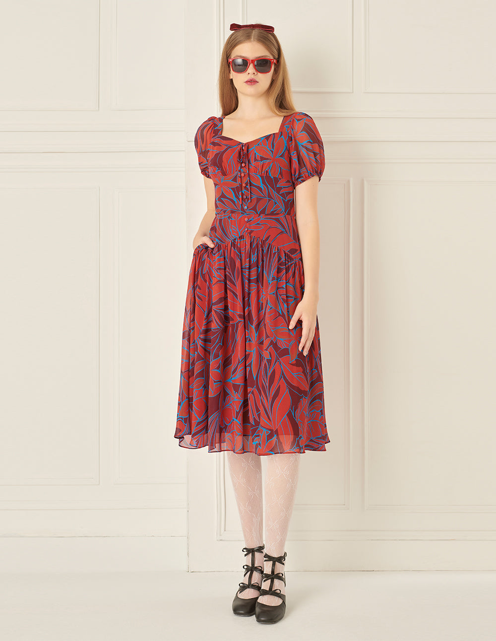 BORA AKSU Puff Sleeves And Small Lace Waist And Pleated Floral Dress
