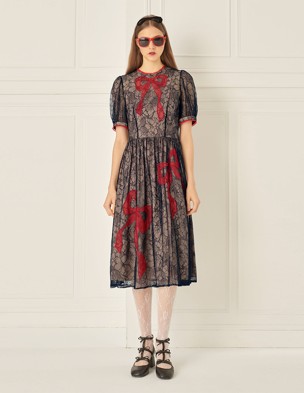 BORA AKSU Puff Sleeve Bow Embroidered Lace Dress