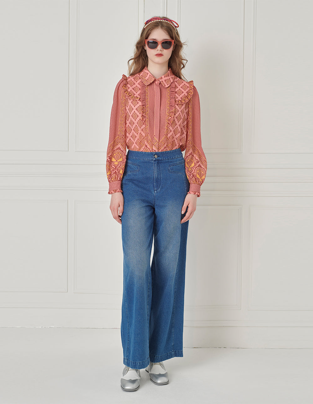 This designer printed shirt combines simplicity and elegance, using smooth lines to evoke British romanticism. The orange-pink damask print captures the nostalgic charm of a classic manor, bringing poetic elegance to the design. Delicate frills add light movement, enhancing its soft and graceful appeal.