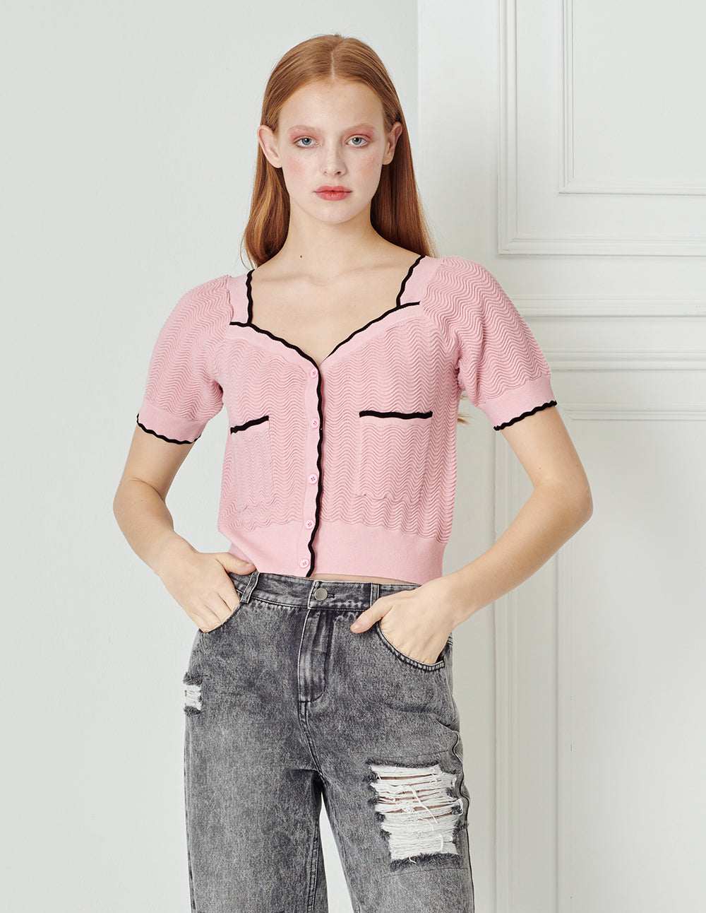 The knitted cardigan is cut from dry and soft blended cotton yarn, and the wavy texture weave adds vitality and variation. The neckline, cuffs, and patch pockets are embellished with small black waves in contrasting colors, and the short fit fits easily to create a generous and simple sweet urban look.