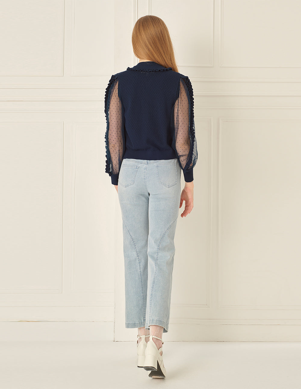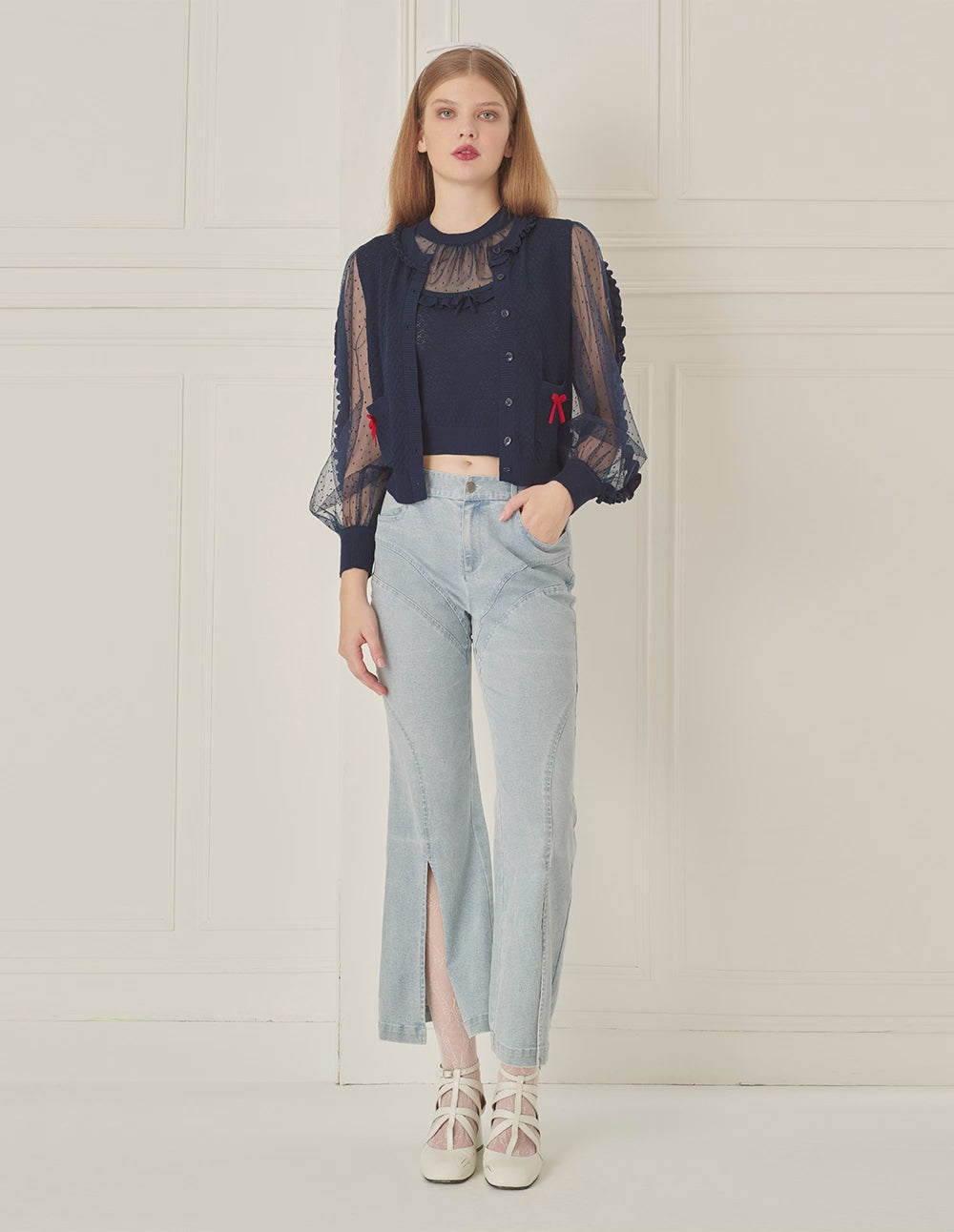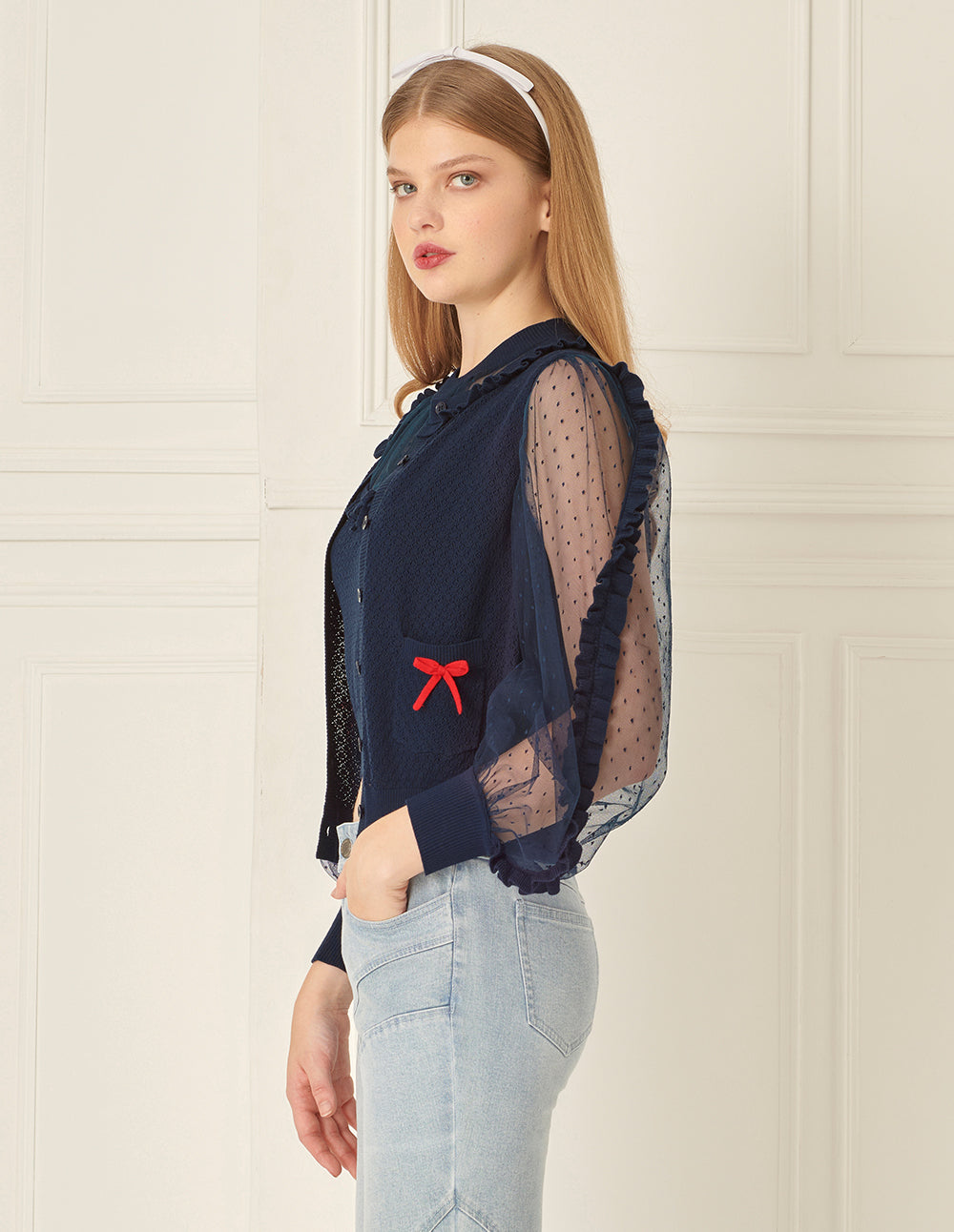 This knitted cardigan cleverly blends knitwear with polka-dot mesh. Knitted ruffles on the chest add a smart and sweet detail, while the deep navy tone offers a modern touch. The overall look is romantic and relaxed, perfect for a laid-back summer feel.