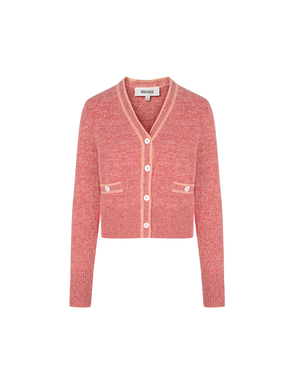 This knitted cardigan features a classic short V-neck design for a neat, flattering fit. It uses a two-toned brushed yarn for a blended gradient effect, enriched with a delicate coral pink to showcase intricate craftsmanship. Dry, soft, and fine to the touch, it easily creates a fresh, vibrant look for early autumn.