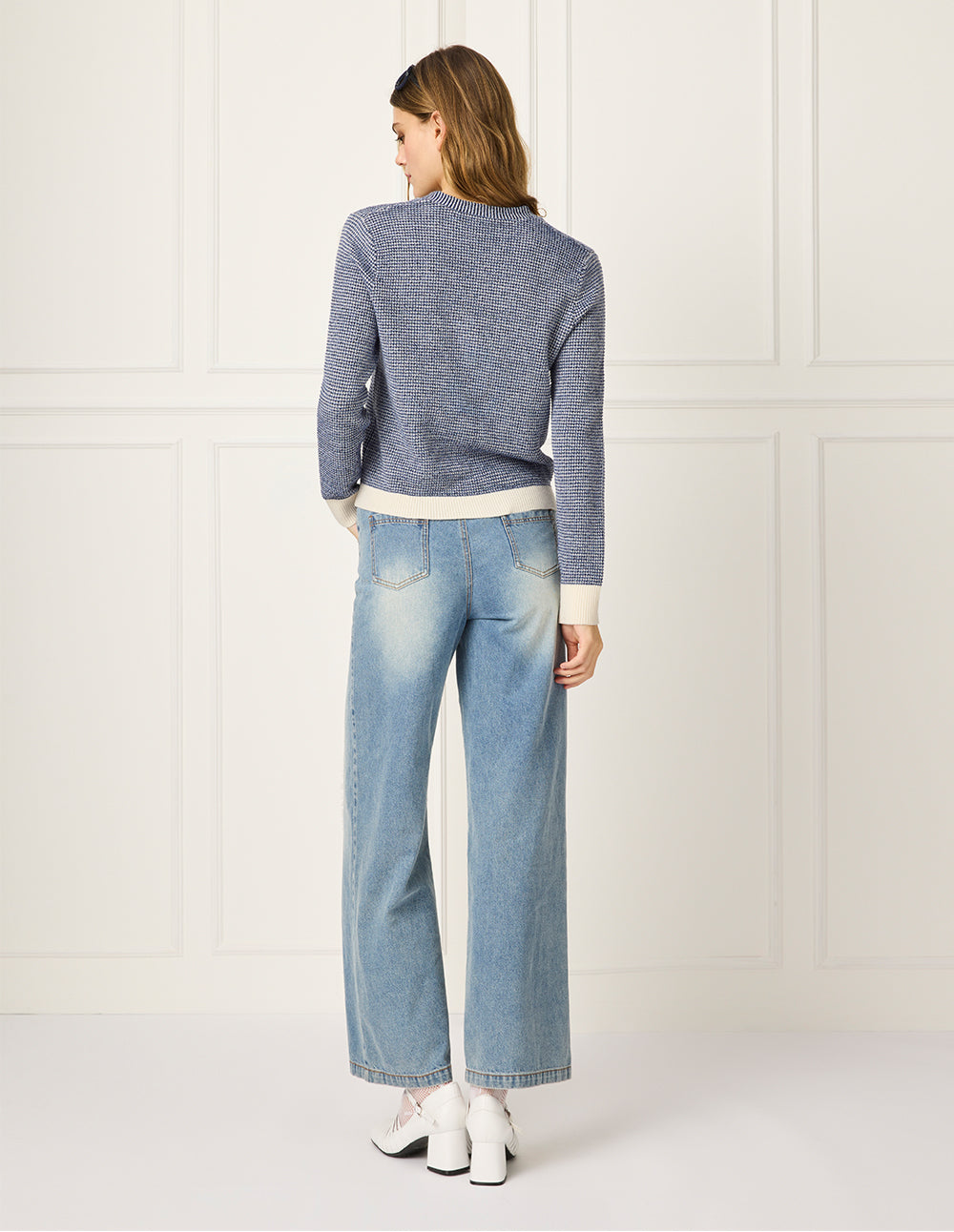 This knitted cardigan continues a classic fitted silhouette for relaxed yet refined wear. An intricate tweed design is woven in deep navy blue, emphasizing a polished and elegant style.