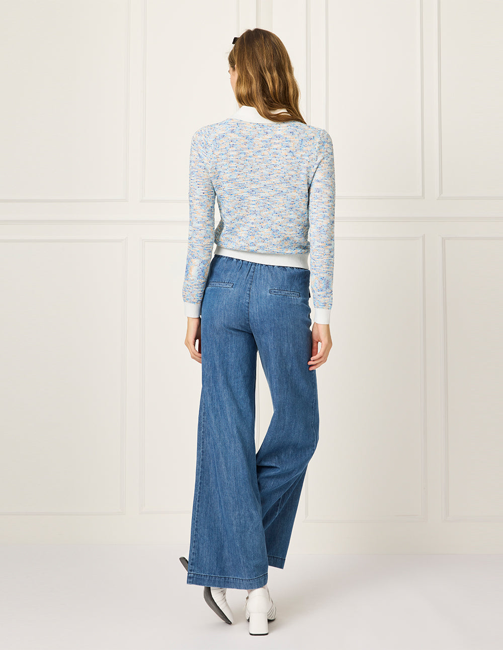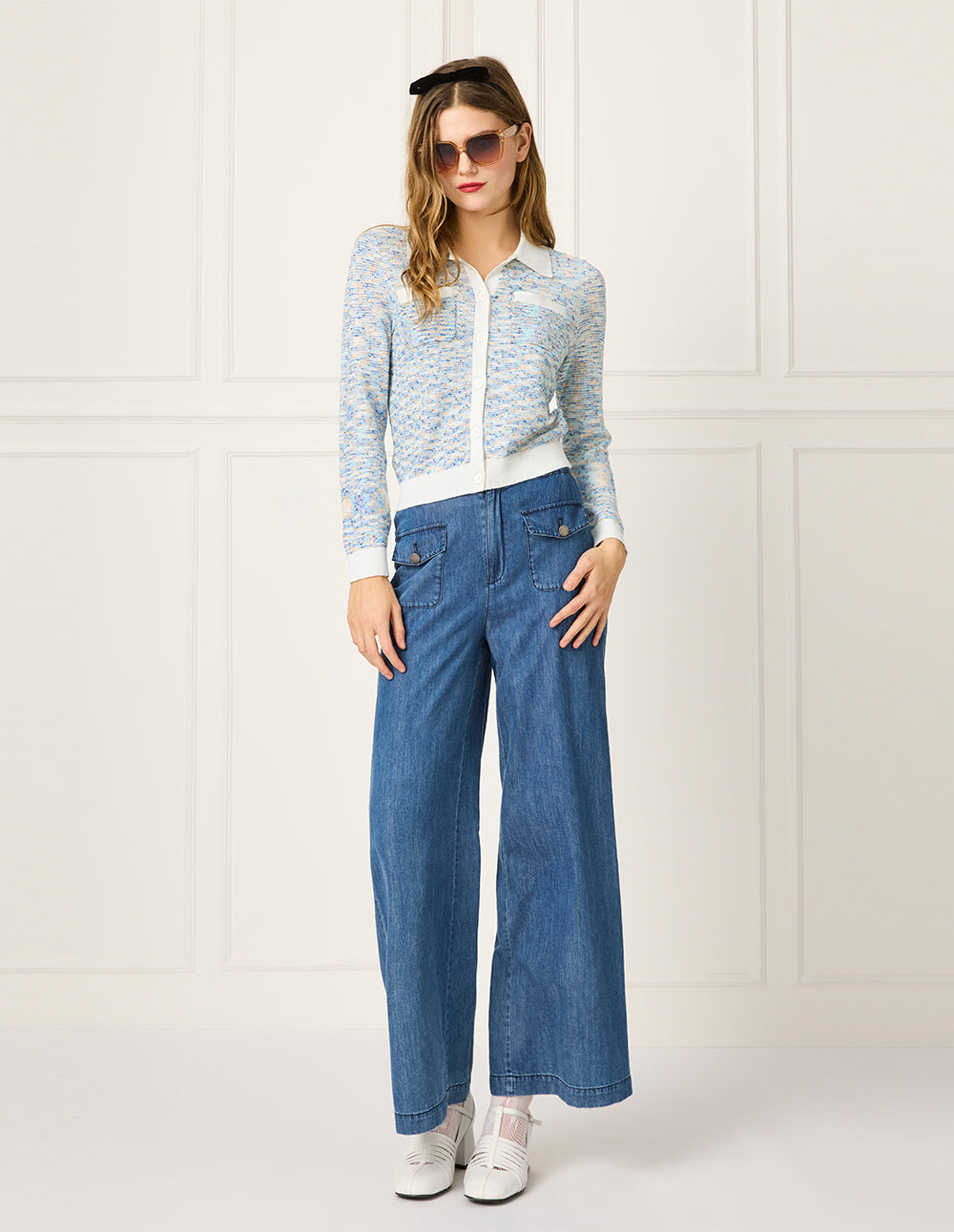 This knitted cardigan is crafted in a fresh, elegant sky blue with white panels, featuring smooth, clean tailoring for a fitted silhouette. Water-beaded yarn adds a subtle delicate touch, while the fresh color and simple cut make it a spring wardrobe MUST-HAVE.