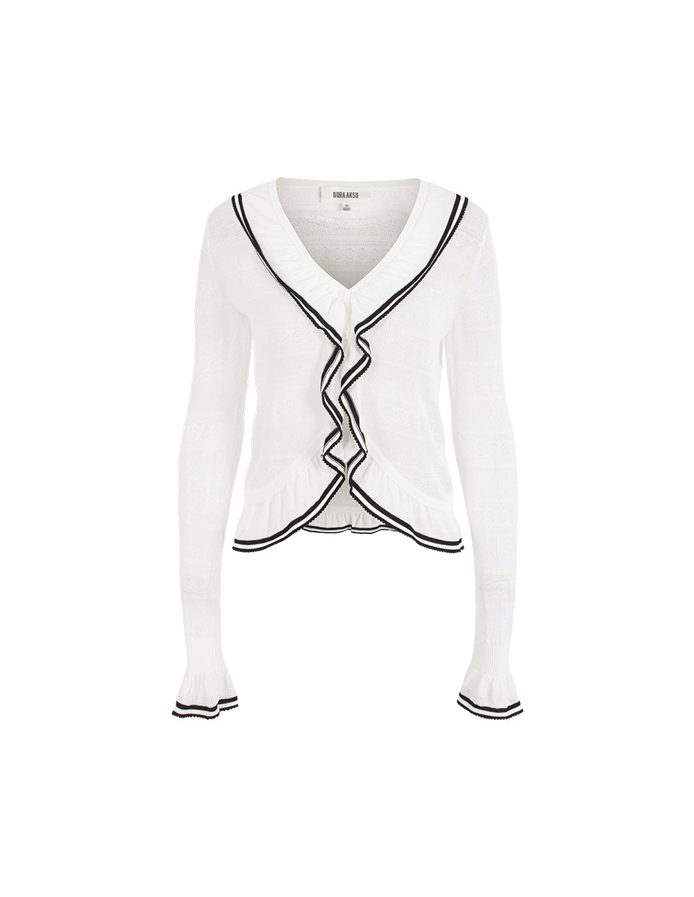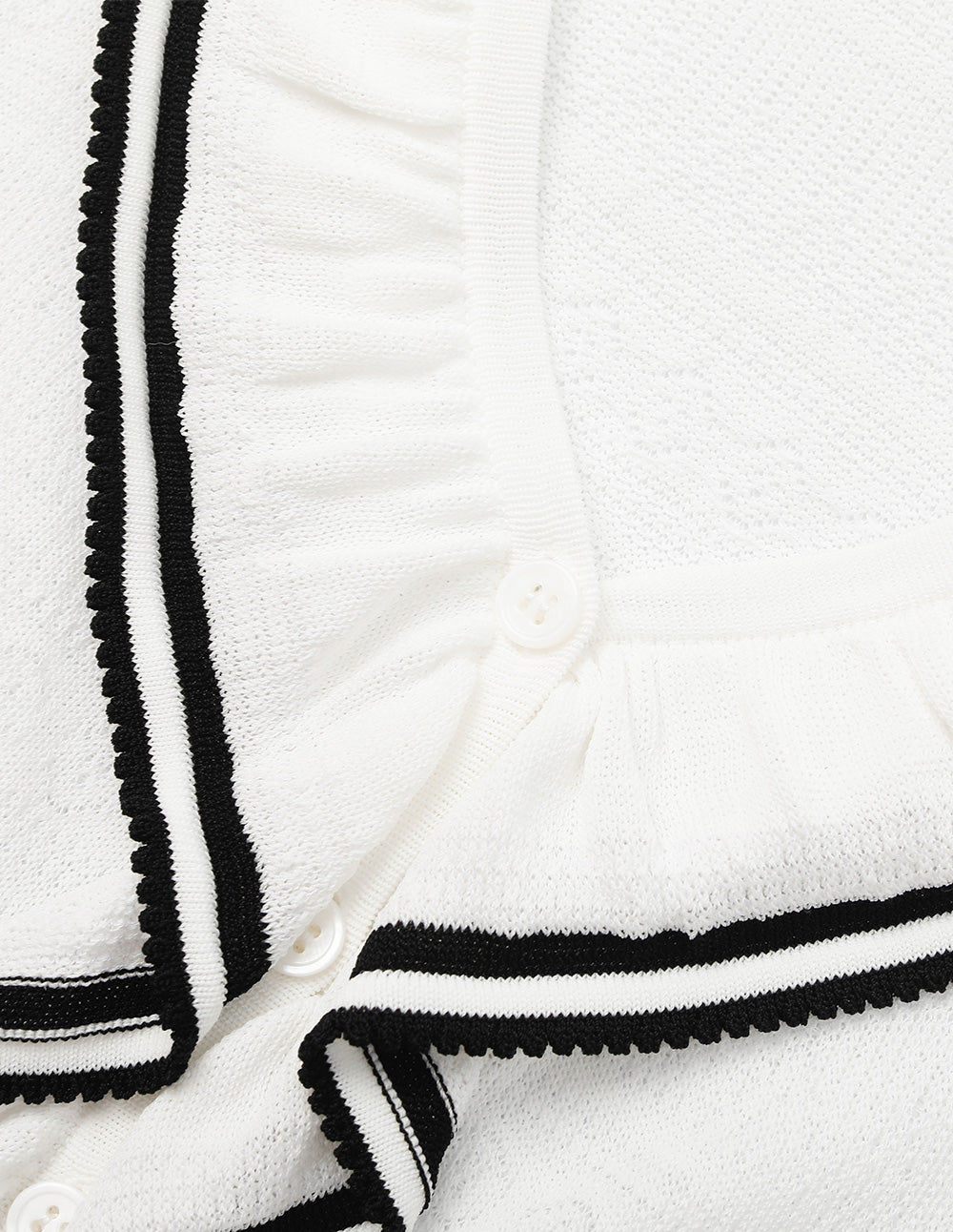 This French-inspired knitted cardigan offers a soft, draping fit with delicate knit texture. The white base and black trim create a fresh, playful look, while ruffled details at the neckline and cuffs soften the shoulders. The rhythmic, refined knit pattern evokes a romantic, elegant atmosphere, perfect for adding a finishing touch to a ladylike look.