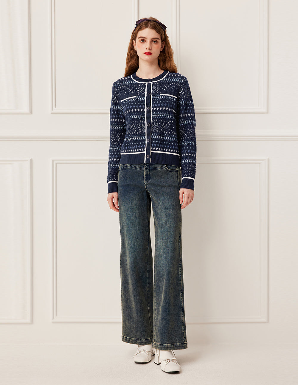The garment features a delicate texture created with alternating shades of blue jacquard, as if the layers of the ocean have been woven into the fabric. The round neck design is simple and elegant, while white trim on the neckline, placket, and hem outlines a clear silhouette, adding a touch of brightness to the deep navy blue. The jacquard pattern is three-dimensional and textured, making it perfect for wearing alone or as an outer layer, adding warmth and sophistication to autumn and winter outfits.
