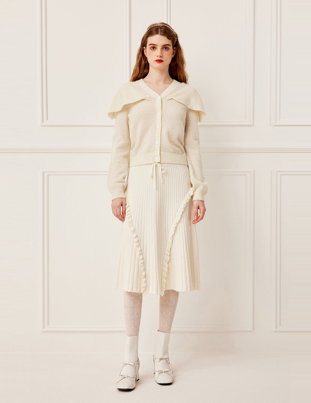 This soft creamy white hue captures the beauty of autumn and winter. The simple V-neck design elegantly frames the neckline, while the three-dimensional ruffles on both shoulders drape lightly like a shawl, adding depth and agility to the simple silhouette. This design combines everyday practicality with design ingenuity. Whether paired with a dress to extend the romantic atmosphere or high-waisted pants to create an intellectual atmosphere, it will add a touch of poetry and sophistication to your autumn and winter wardrobe.
