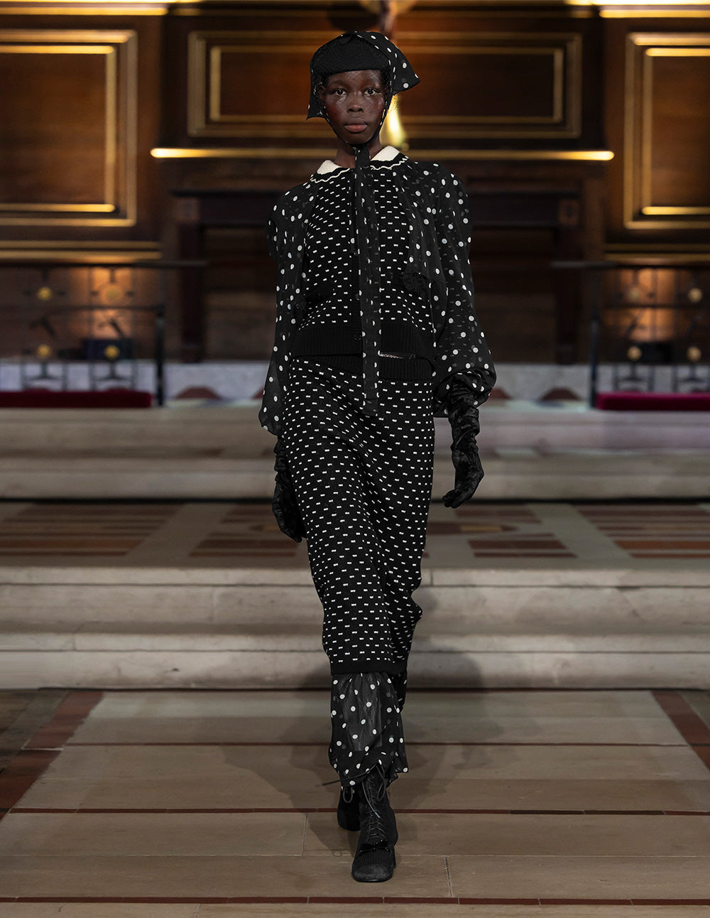 A classic black base is sprinkled with romantic white polka dots for timeless vintage appeal. A half‑open white round neck frames the face, while contrast cuffs complete the playful yet polished look. Wear it alone for sleek style, or layer it for depth—pair it with a high‑waisted skirt or jeans for effortless French‑inspired retro chic.