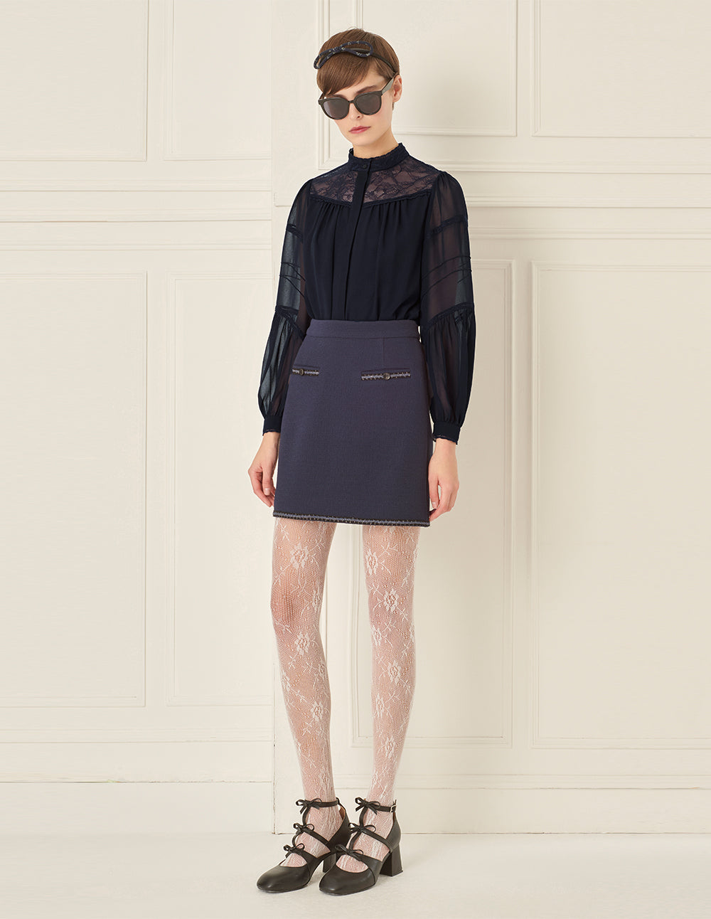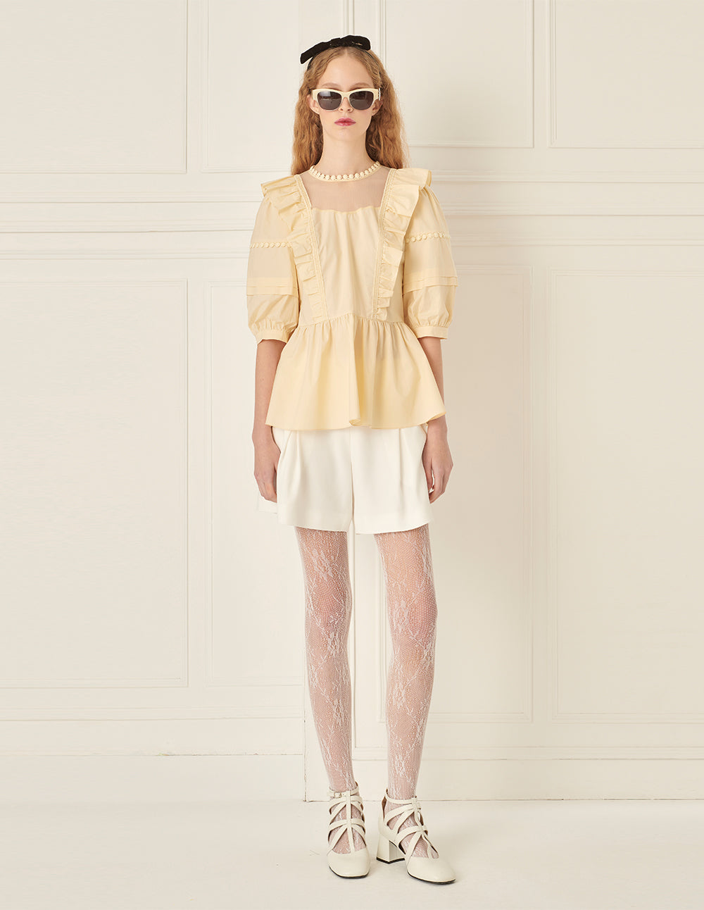 BORA AKSU Puff Sleeve Mesh Collar Patchwork Top