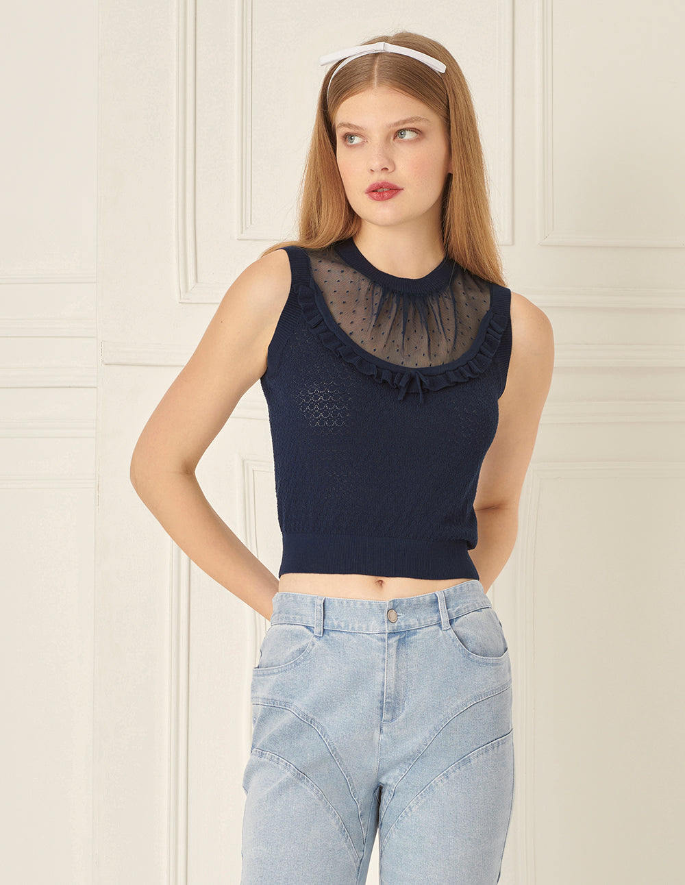 This knitted vest cleverly combines knitwear with polka-dot mesh. The chest is adorned with knitted ruffles for a smart, sweet look. The deep navy blue tone feels modern, creating an overall mood that is romantic and relaxed.