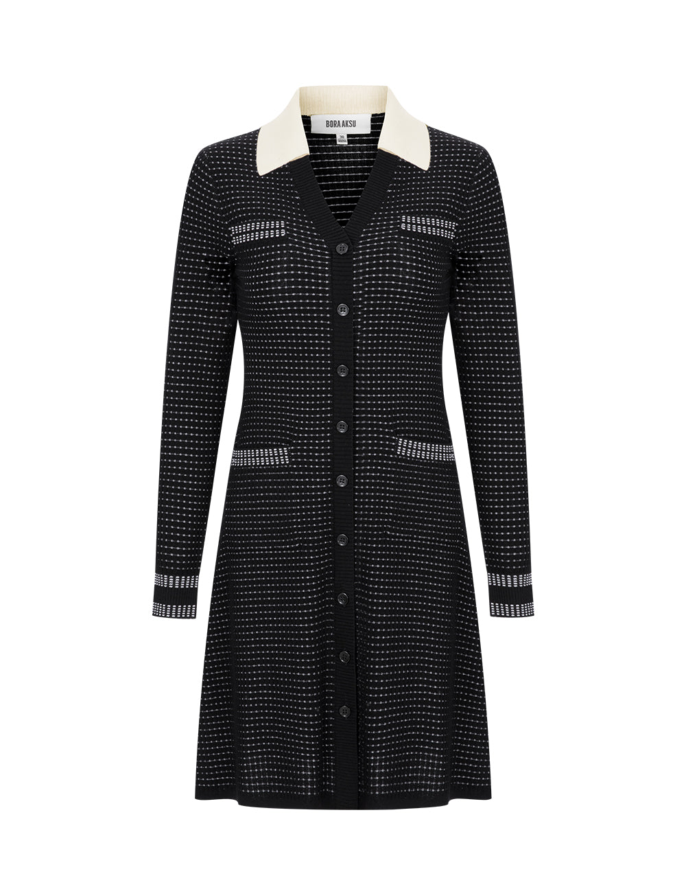 The knitted dress is made of soft and delicate sheep’s wool, and the simple lines hide soft warmth; gold and silver threads are embellished. Combined with white lapels it has a refined style with a retro feel.