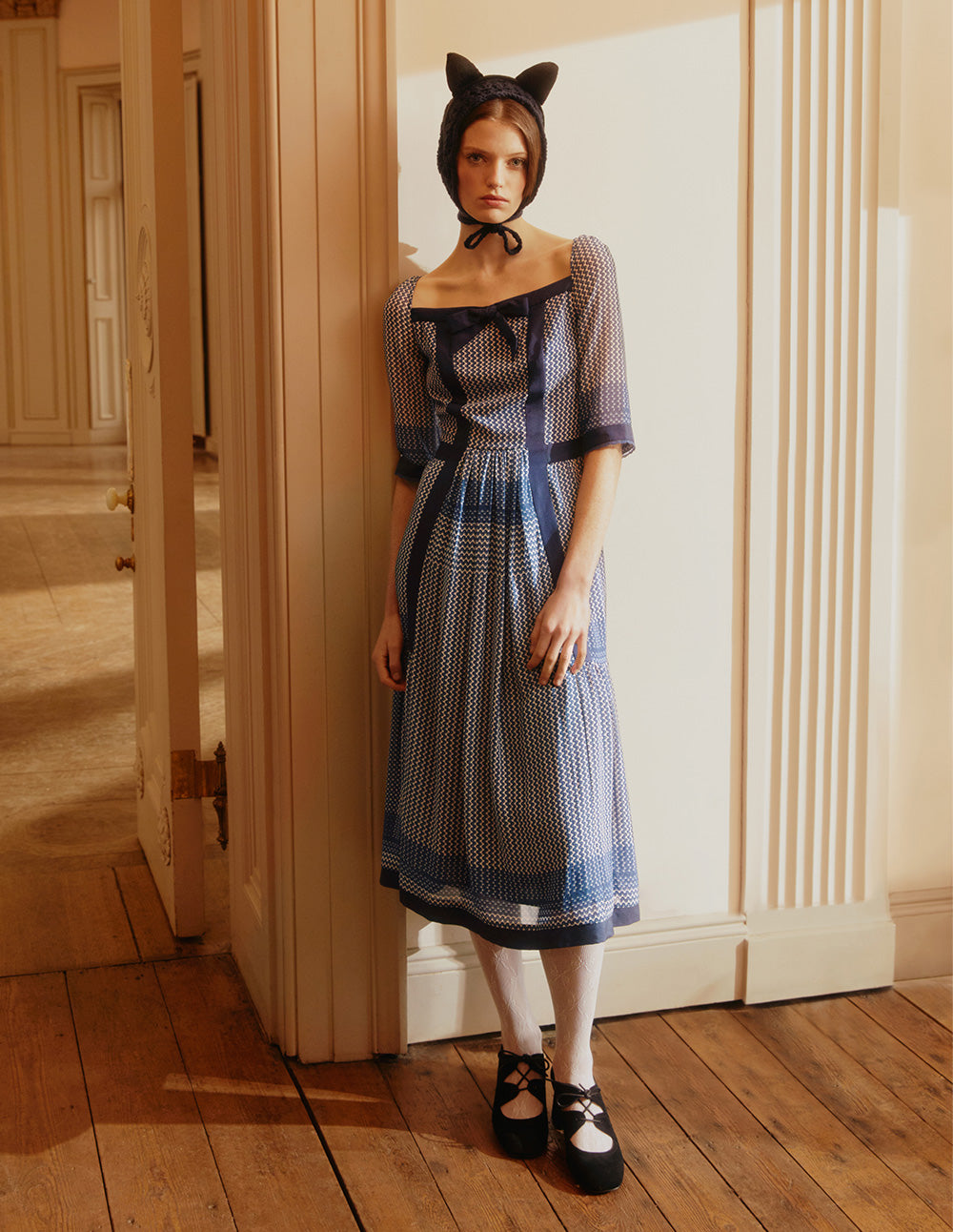 The Atomic Ocean series dress presents a rich visual effect with gradient blue color dots. The retro diamond collar and bow decoration embody timeless elegance. The vibrant blue atoms, symbolizing new life, and the deep blue atoms, representing wisdom, rotate, collide, and merge—at times forming a solemn formation, romantically exploring the boundless and eternal.