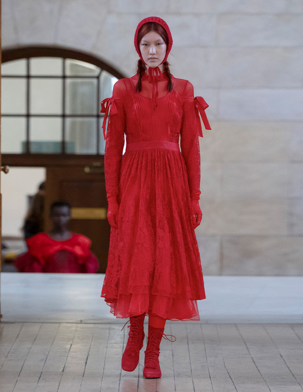 The dress is made of exquisite openwork lace and lustrous silk fabric, capturing the beautiful and romantic Victorian style. The off-shoulder suspender design reveals a hint of skin, while the passionate red hue showcases a chic and glamorous look.