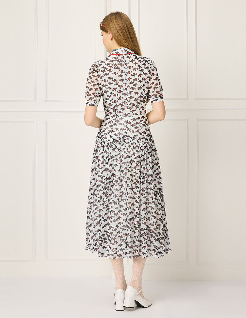 This dress is made from lightweight fabric paired with romantic printing techniques. A Peter Pan collar is accented with contrast lace, refreshing the classic ladylike style, while red-and-white heart prints add youthful sweetness. The soft silhouette and smart details combine, creating an aesthetic that feels both spirited and fresh.