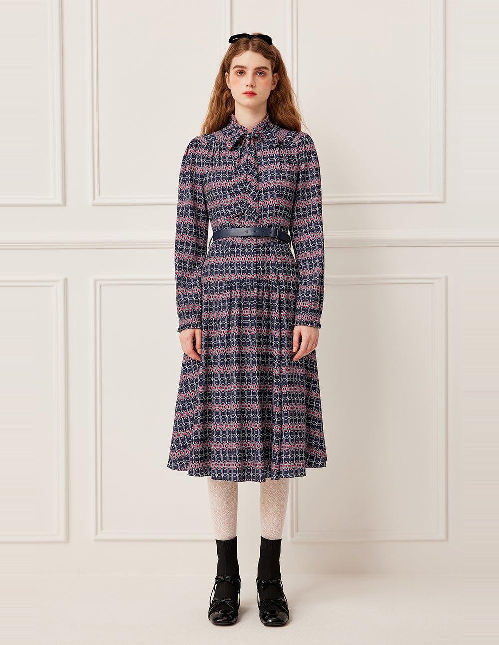 Inspired by the fusion of modern art and Eastern aesthetics, this piece features a navy‑blue base adorned with vibrant red‑and‑white circular geometric prints, evoking a wearable contemporary painting. A stand‑up collar and neck ribbon create an elegant neckline, while a fitted waist and black belt accentuate feminine curves. The relaxed, long silhouette offers both comfort and style.