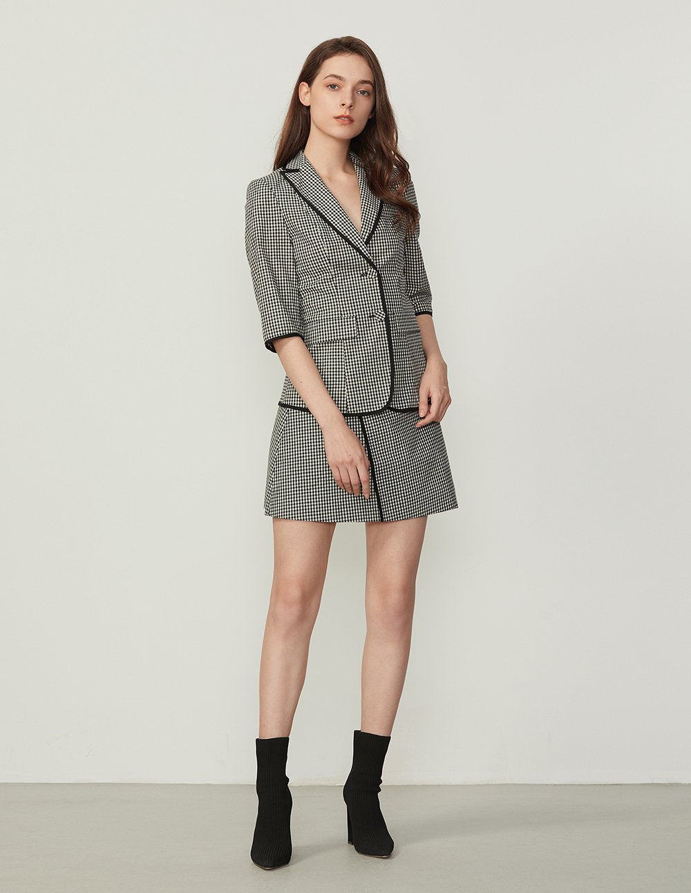 The plaid A‑line skirt is crafted with smooth, clean lines, enhanced by three‑dimensional pleating. Paired with the matching blazer from the same collection, it creates a youthful yet elegant look.