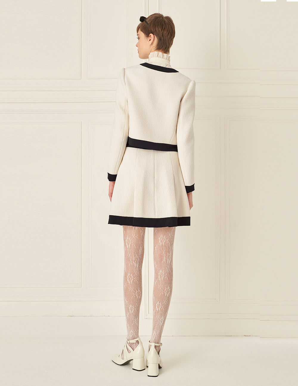 The skirt is made of finely textured fabric and is paired with retro black trim, creating a romantic French style. Combined with the matching top, it forms a sophisticated and comfortable urban look.