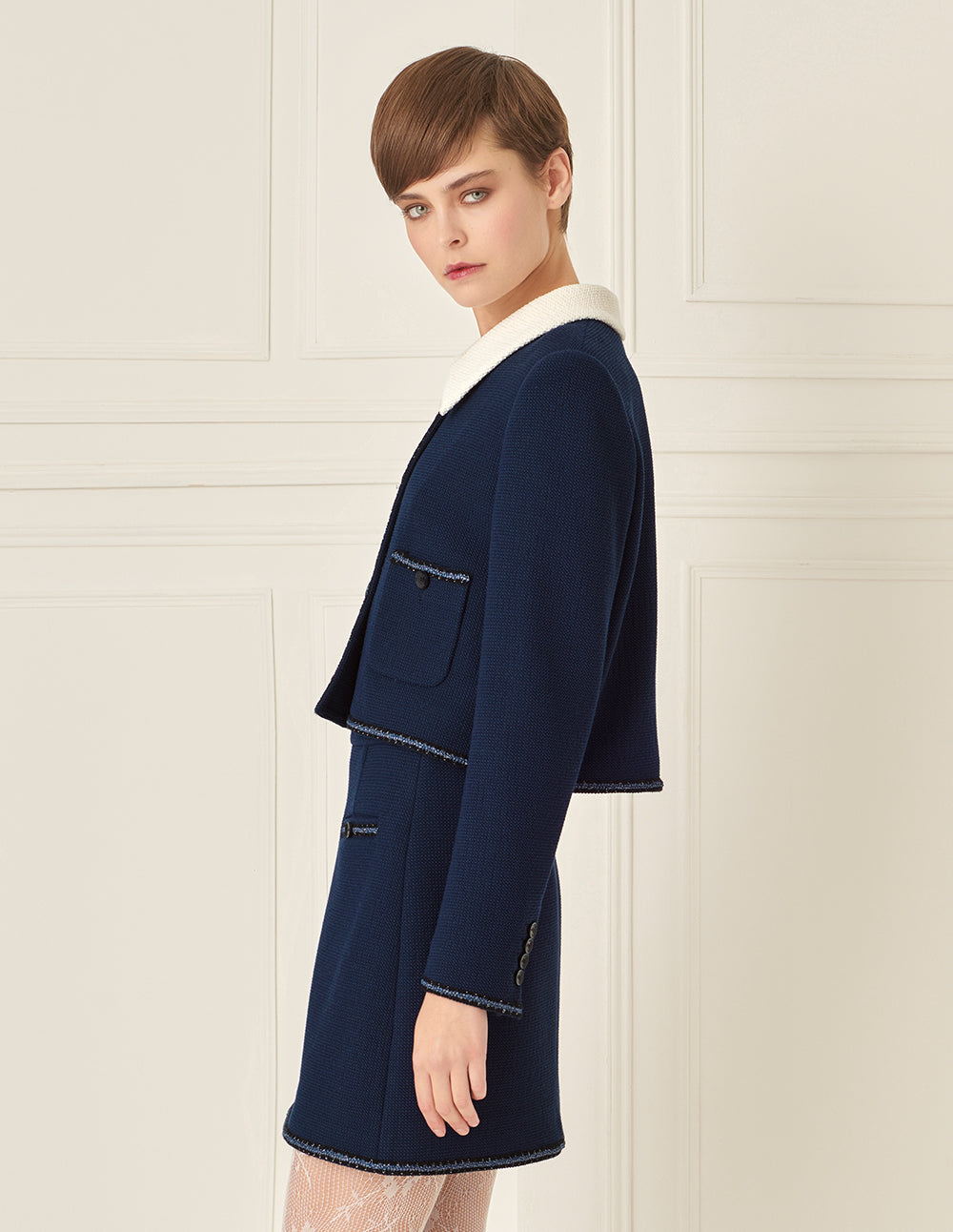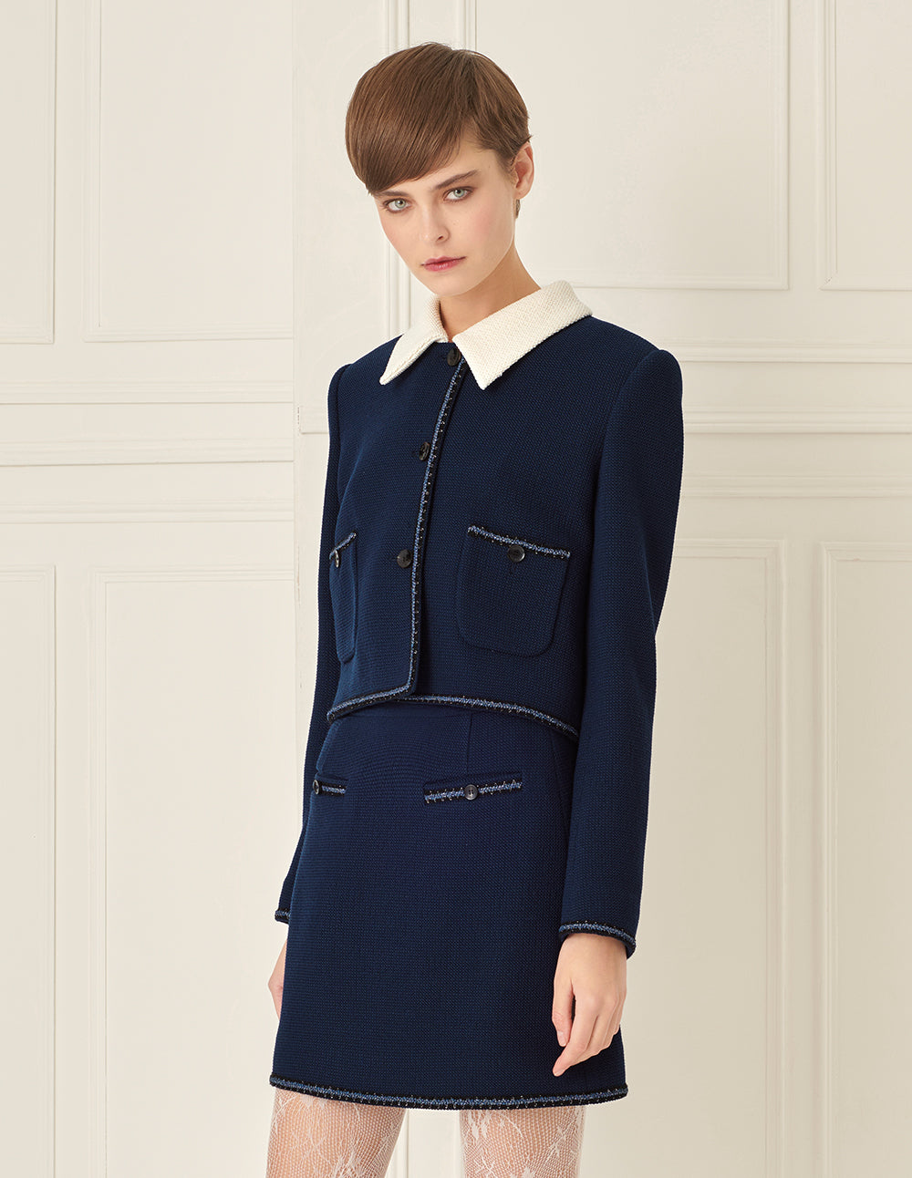 The skirt is cut cleanly and smoothly. The slight A-line, cropped shape flatters the figure, while the fabric texture is refined and comfortable to wear. Piping details enhance the design. Paired with the matching jacket, it helps you create a modern urban image.