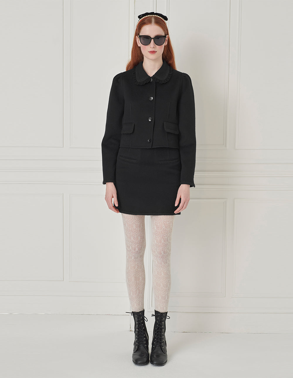 This classic, versatile A-line skirt features a clean, smooth cut and is crafted from soft wool double-faced fabric to highlight its unique texture. Delicate lace detailing adds the perfect finish to the simple design. Paired with the matching jacket, it creates a modern urban look.