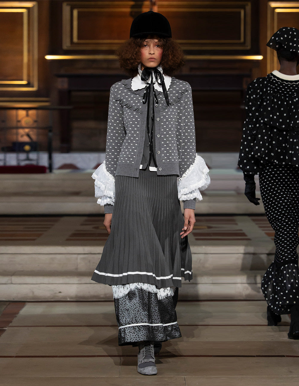 Fine pleats align like piano keys, and a white pinstripe at the hem traces a graceful arc with every step. In dark gray, the skirt offers winter‑ready versatility—wear it with the matching cardigan for a coordinated suit effect, or pair it with a knit for polished, intellectual style, keeping romance alive even in colder seasons.