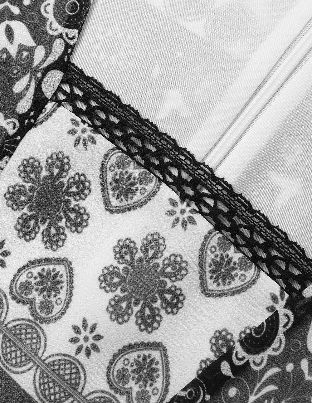 This dress features a black and white floral pattern that brightens the design with fresh, elegant charm. The retro square neck and batwing sleeve silhouette effortlessly create French-inspired style. Delicate lace details add a sweet contrast, showcasing elegance and romance.