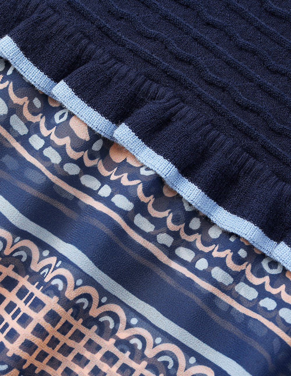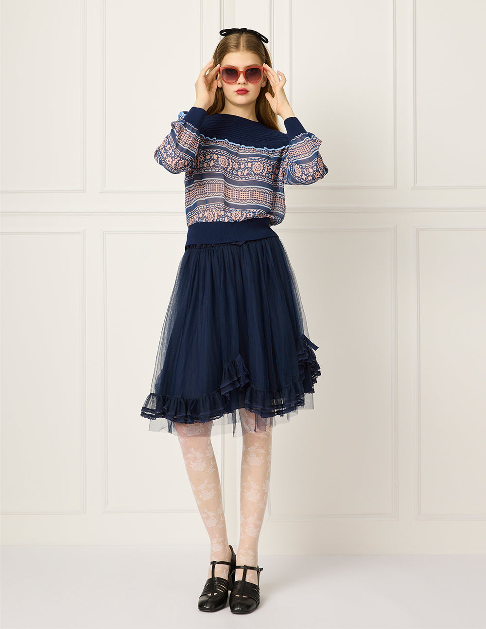 This needle-shuttle top features a knitted earring detail that adds romantic charm. An exquisite ripple texture creates dimensional softness, while abstract floral prints evoke a dreamy, artistic early-spring aesthetic.